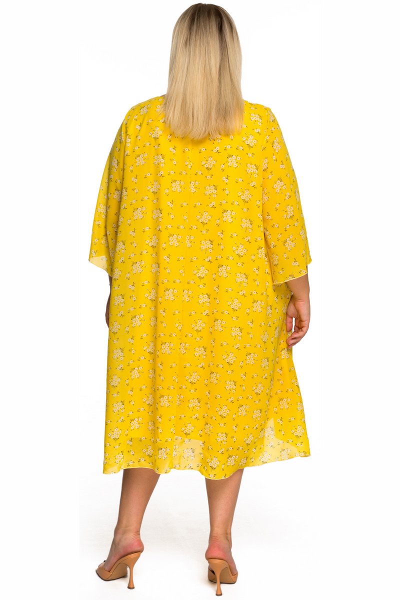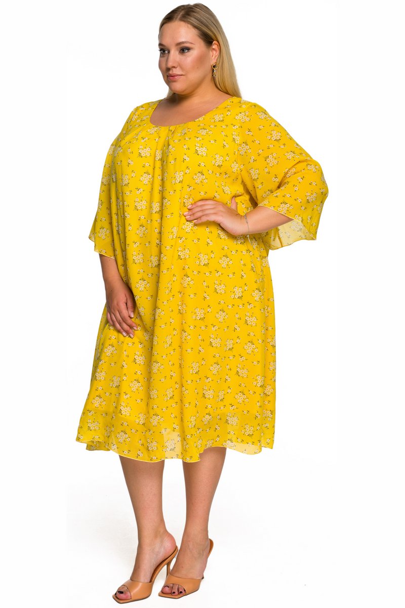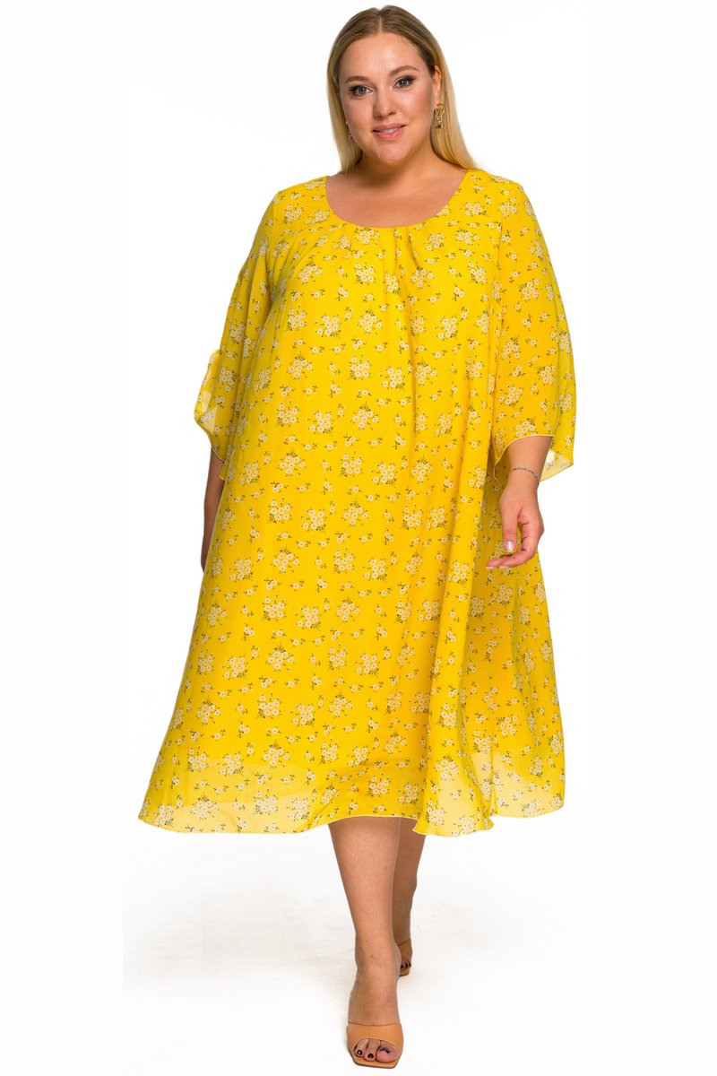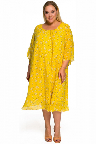Воздушное платье силуэта трапеция из шифона с расклешенным рукавом. По горловине переда заложены защипы.