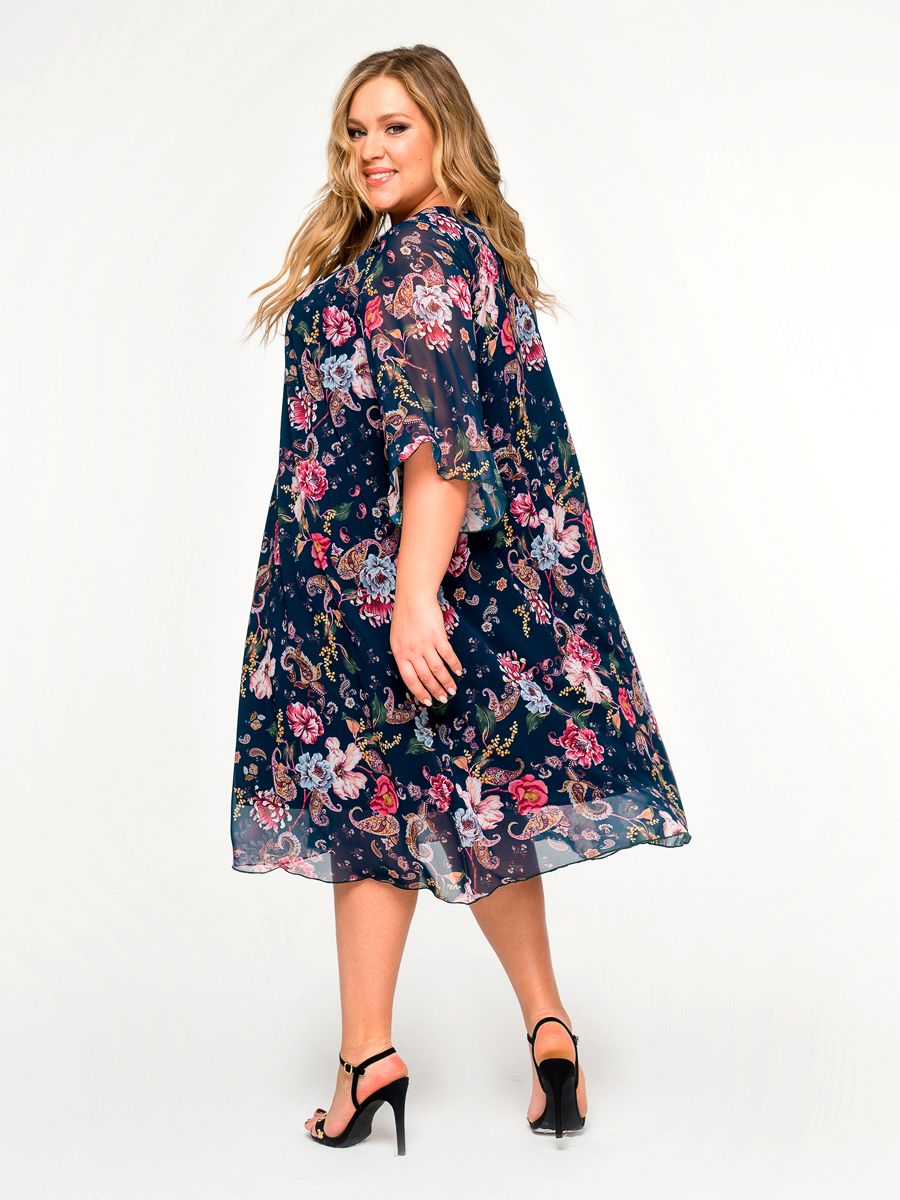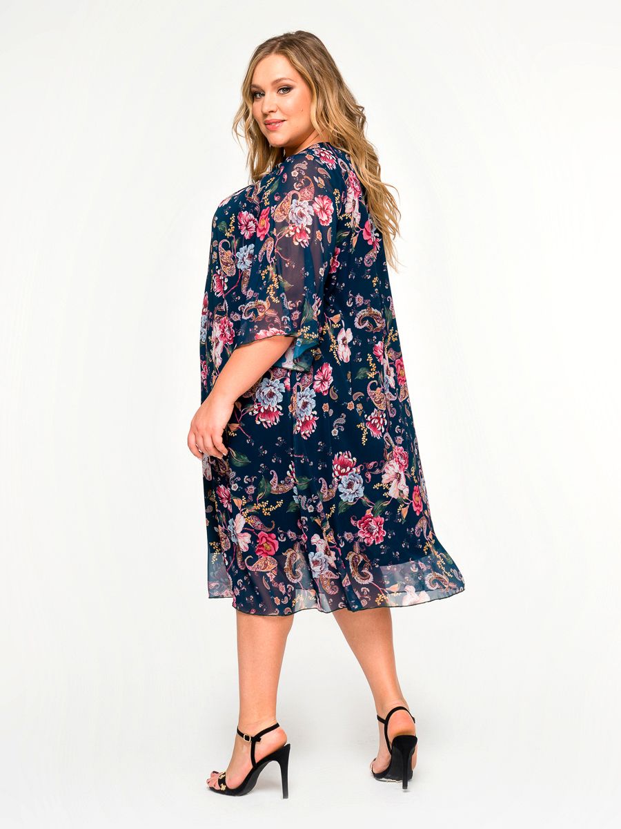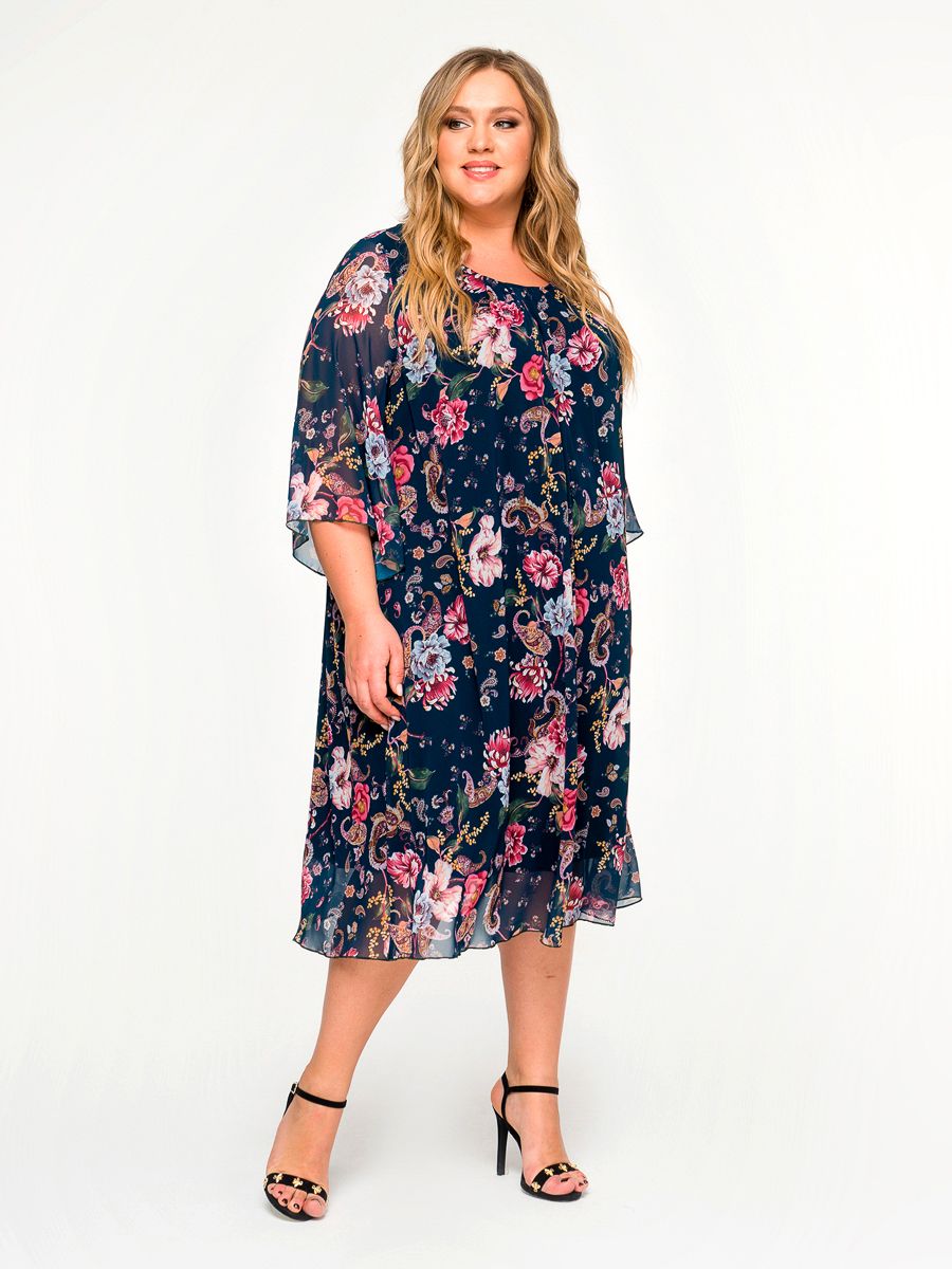 Воздушное платье силуэта трапеция из шифона с расклешенным рукавом, по горловине защипы. Данная модель за счет кроя прекрасно скрывает нюансы фигуры