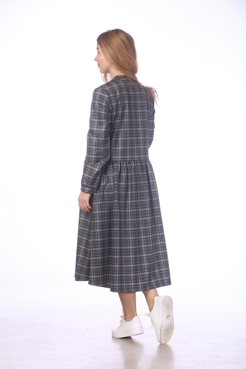 Описание: Платье отрезное по линии талии, на сборке, воротник стойка, карманы