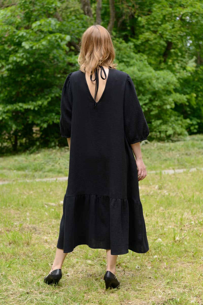 Описание: Платье с оборкой внизу, рукава на сборке, с карманами по бокам, на спинке вырез, муслин.