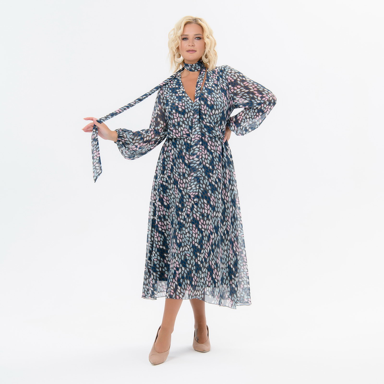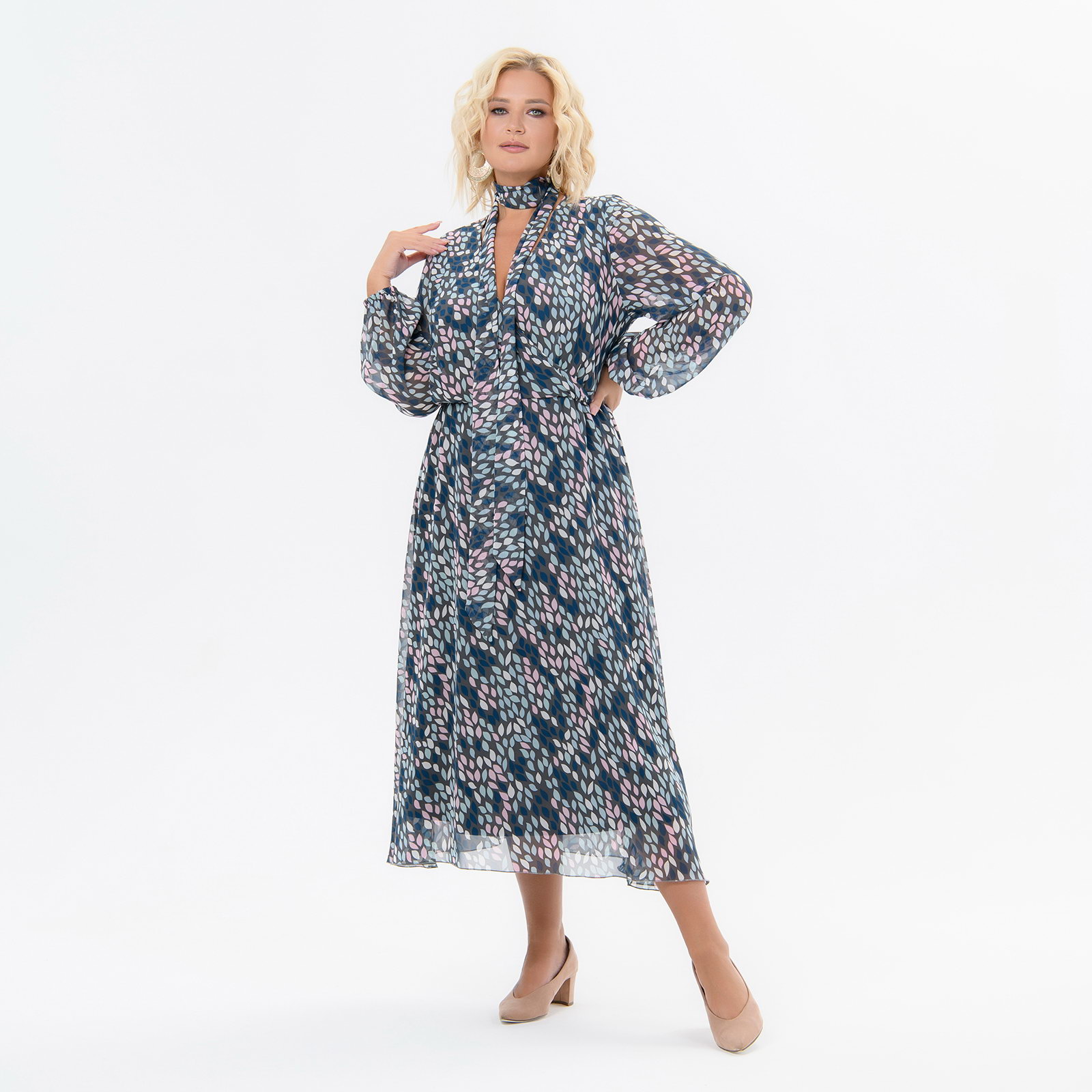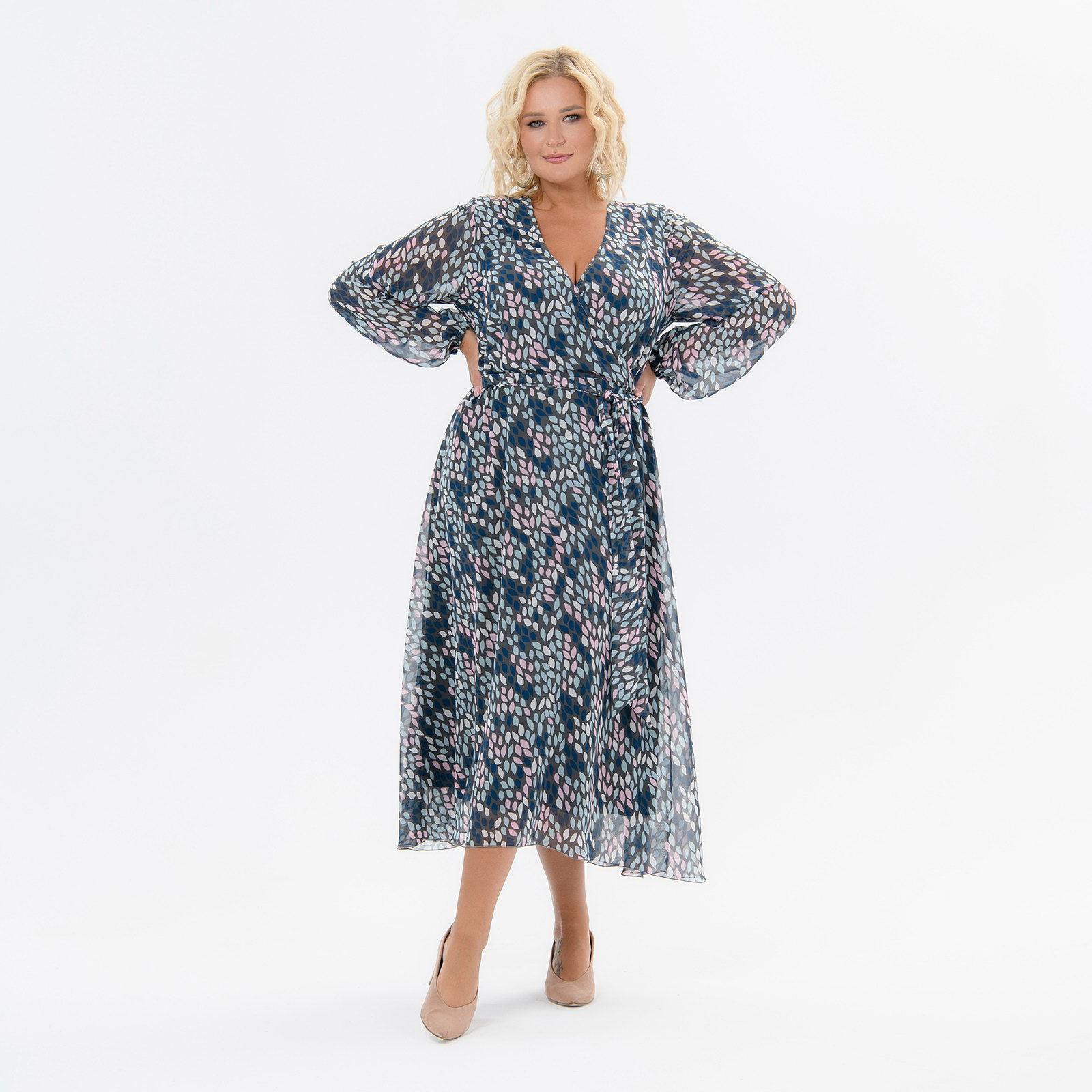 Нежное платье из шифона длиной миди, в котором обЪединены деликатность, чувственность и шик. Мягкие фалды юбки гармонично сочетаются с плавными линиями запАха по лифу.