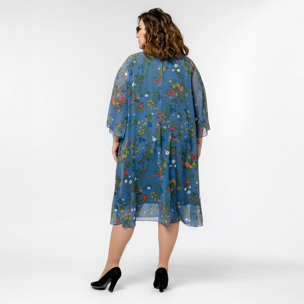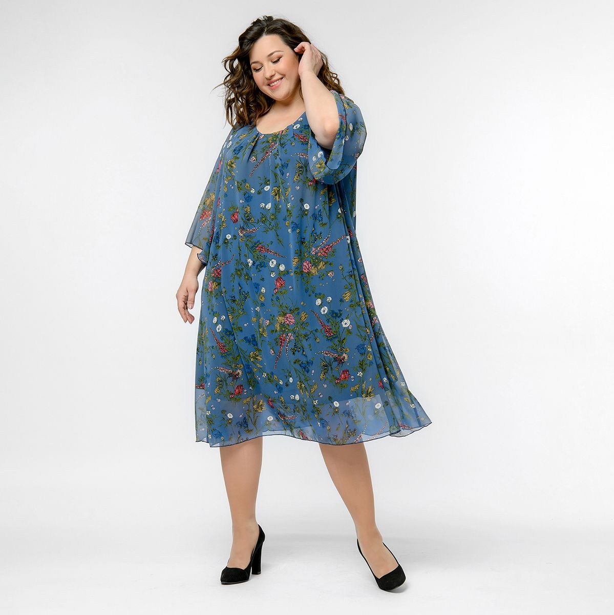 Воздушное платье силуэта трапеция из шифона с расклешенным рукавом. По горловине переда заложены защипы.