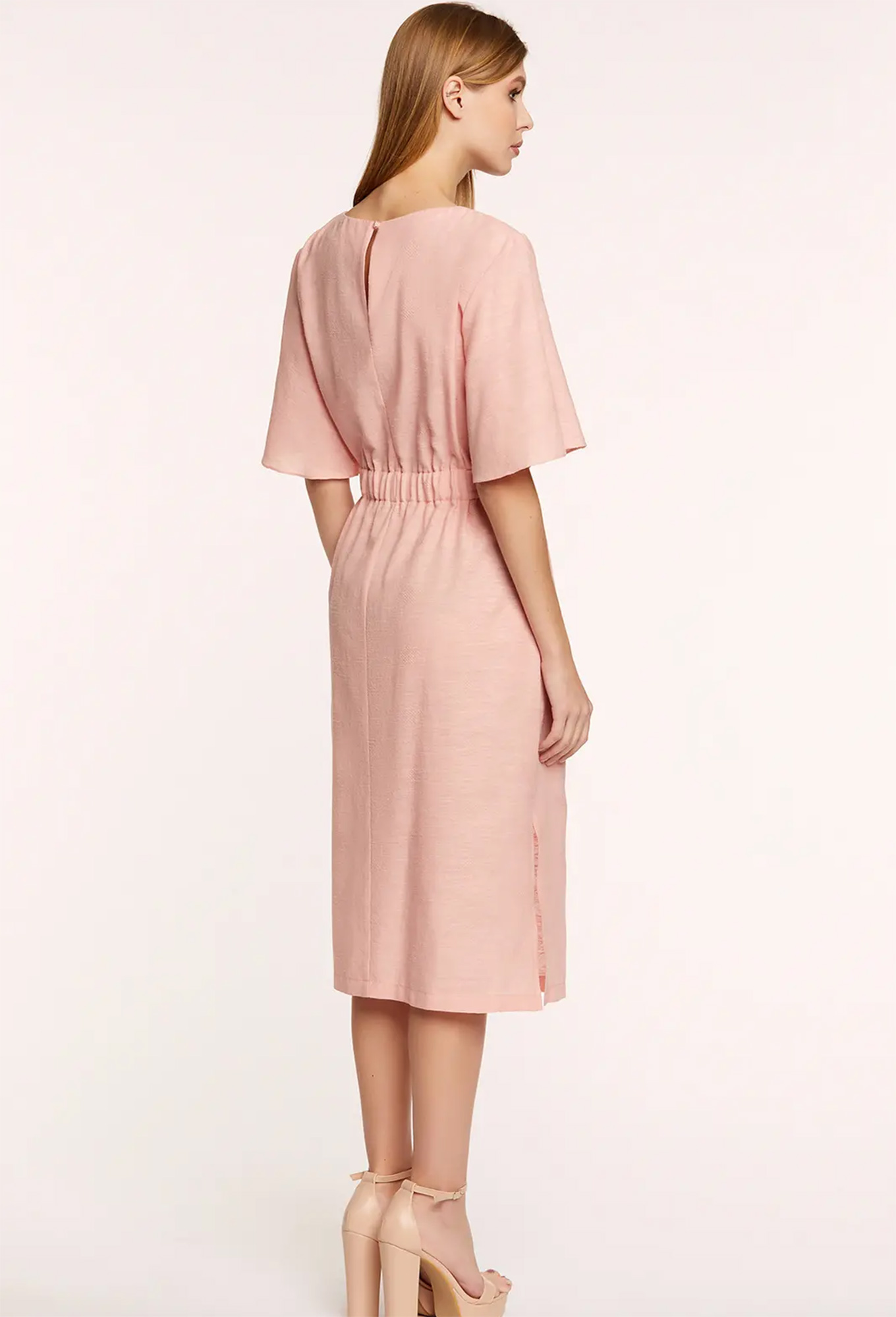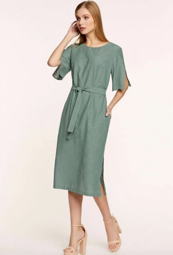 Платье полуприлегающего силуэта с округлым вырезом горловины,спинка со средним швом, в котором обработаны застёжка на одну навесную петлю и одну пуговицу со сборкой в области талии на широкую резинку и притачными деталями пояса, в боковых швах обработаны карманы и разрезы. Рукава втачные двухшовные с высокими разрезами по переднему шву с небольшим расстоянием по низу.