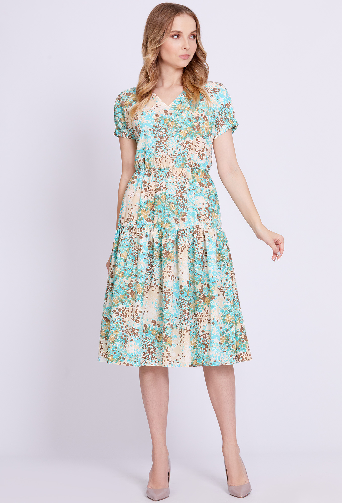 Романтичное платье-миди интересного кроя, отрезное по линии талии и присборенное на резинку, с V-образным вырезом горловины по переду, цельнокроеными рукавами, частично присборенными на резинку и с оборкой по низу.