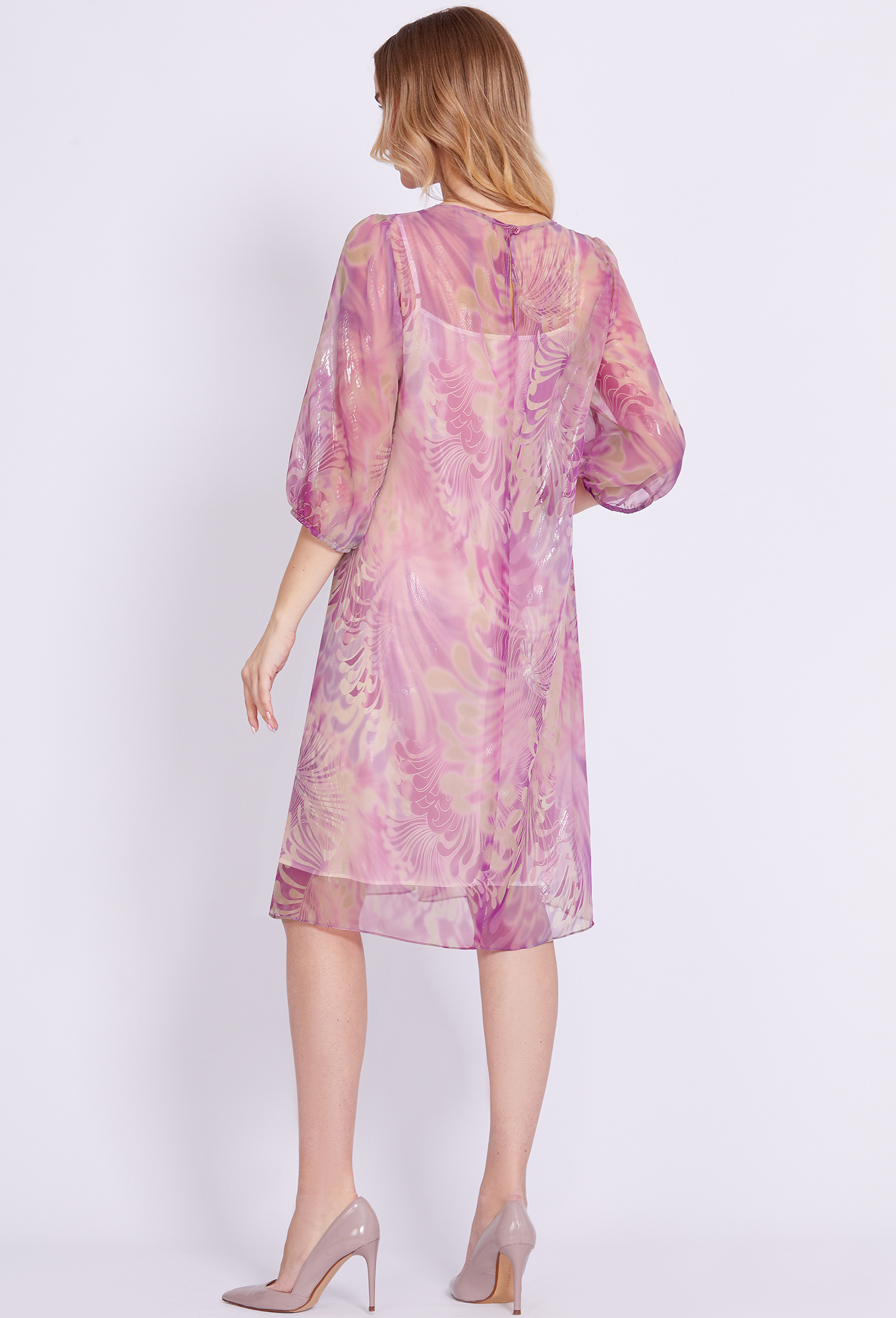 Данная модель платья с интересным неброским принтом станет идеальной основой романтичного образа. Платье А-образного силуэта, со сборкой по горловине переда и застежкой на навесную петлю и пуговицу по спинке. Изделие дополнено нижним платьем из тонкой ткани, но укороченные рукава оставили полупрозрачными.