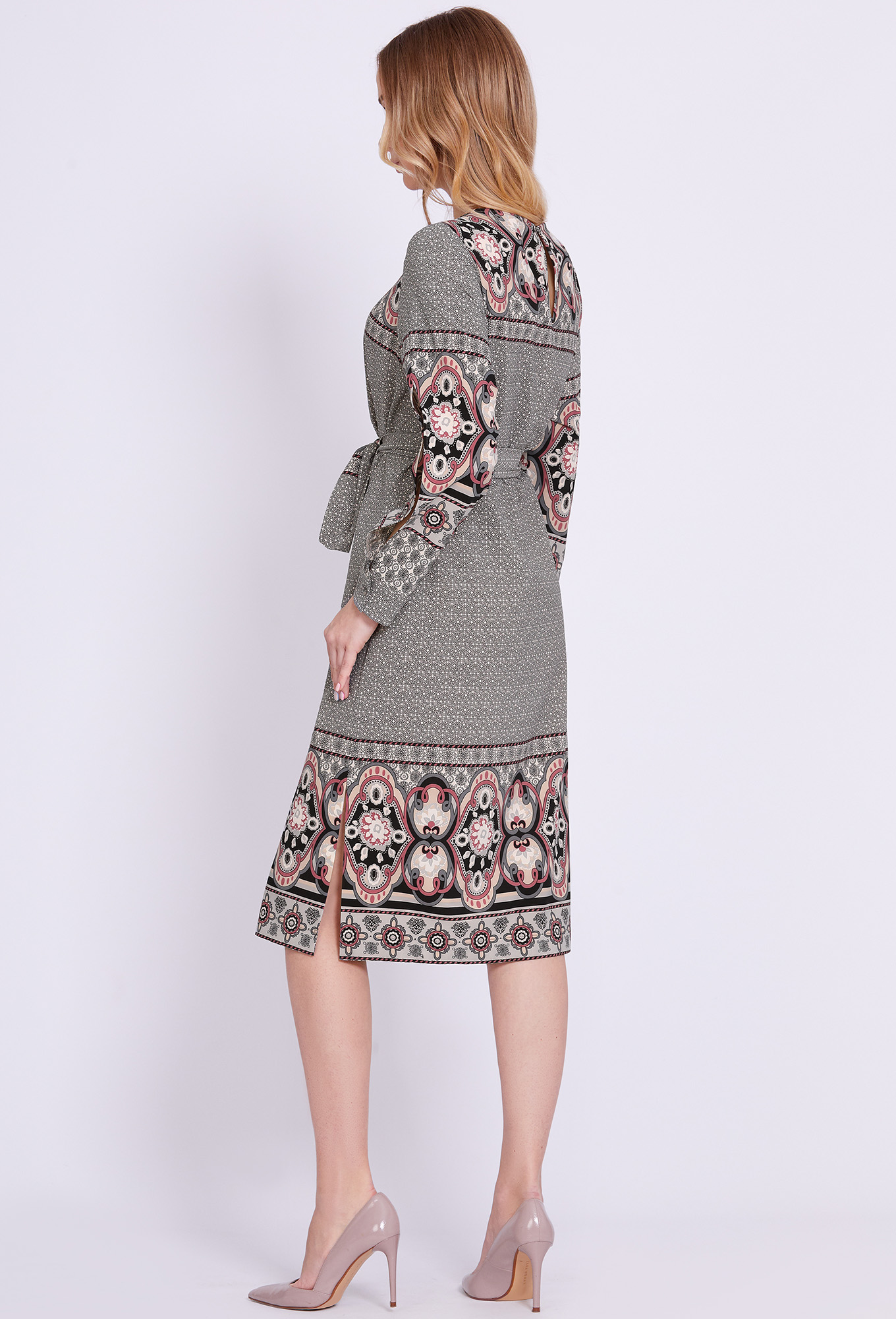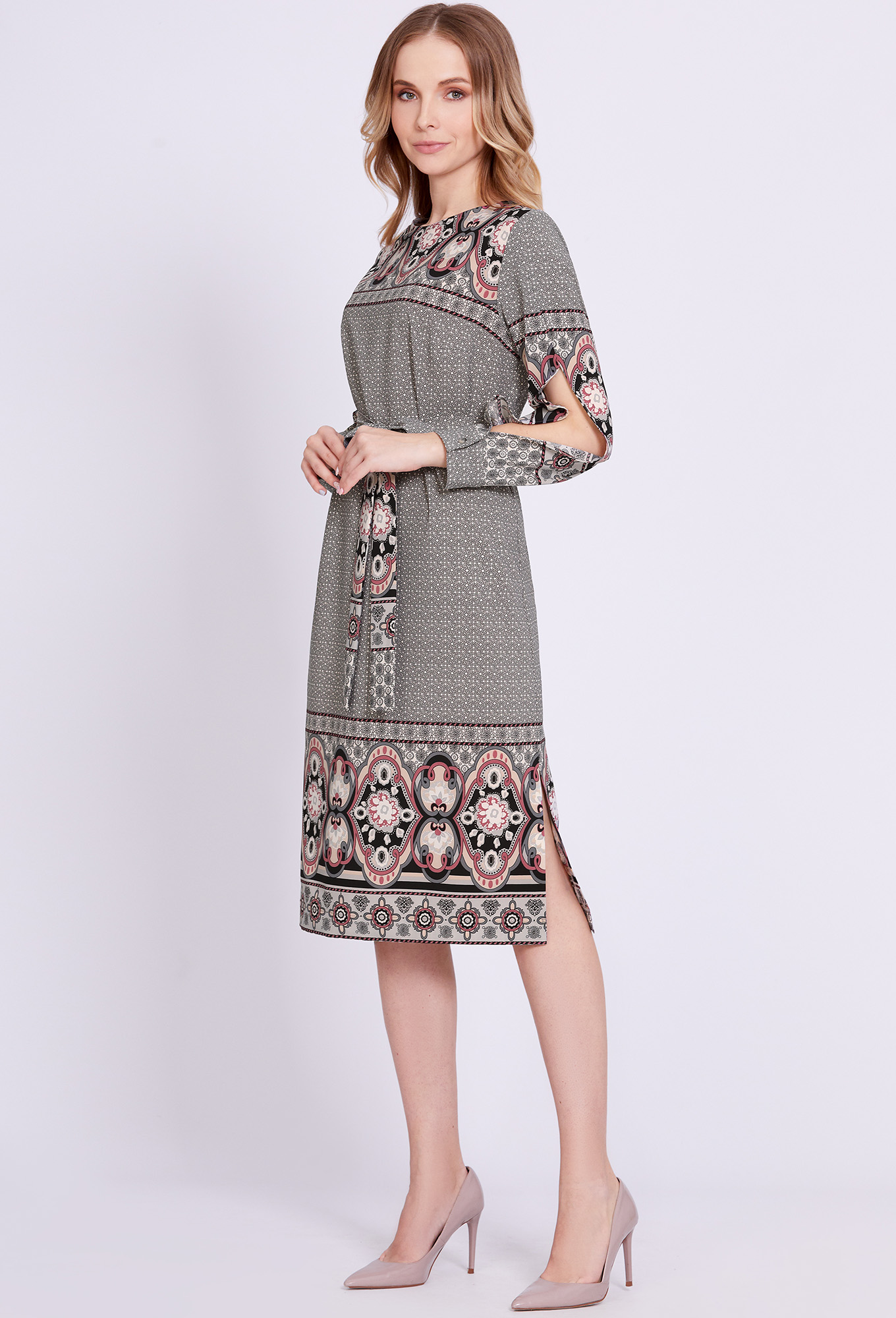 Данная модель миди-платье прямого силуэта – эталон женственного образа. Правильное настроение задали при помощи стильного принта и интересного кроя рукавов с разрезами, частично приоткрывающими руки, и манжетами с отделочными пуговицами. Динамичность модели придают разрезы в боковых швах. По спинке обработана застёжка-капля с навесной петлёй и отделочной пуговицей. Сформировать приталенный силуэт помогает ремень.
