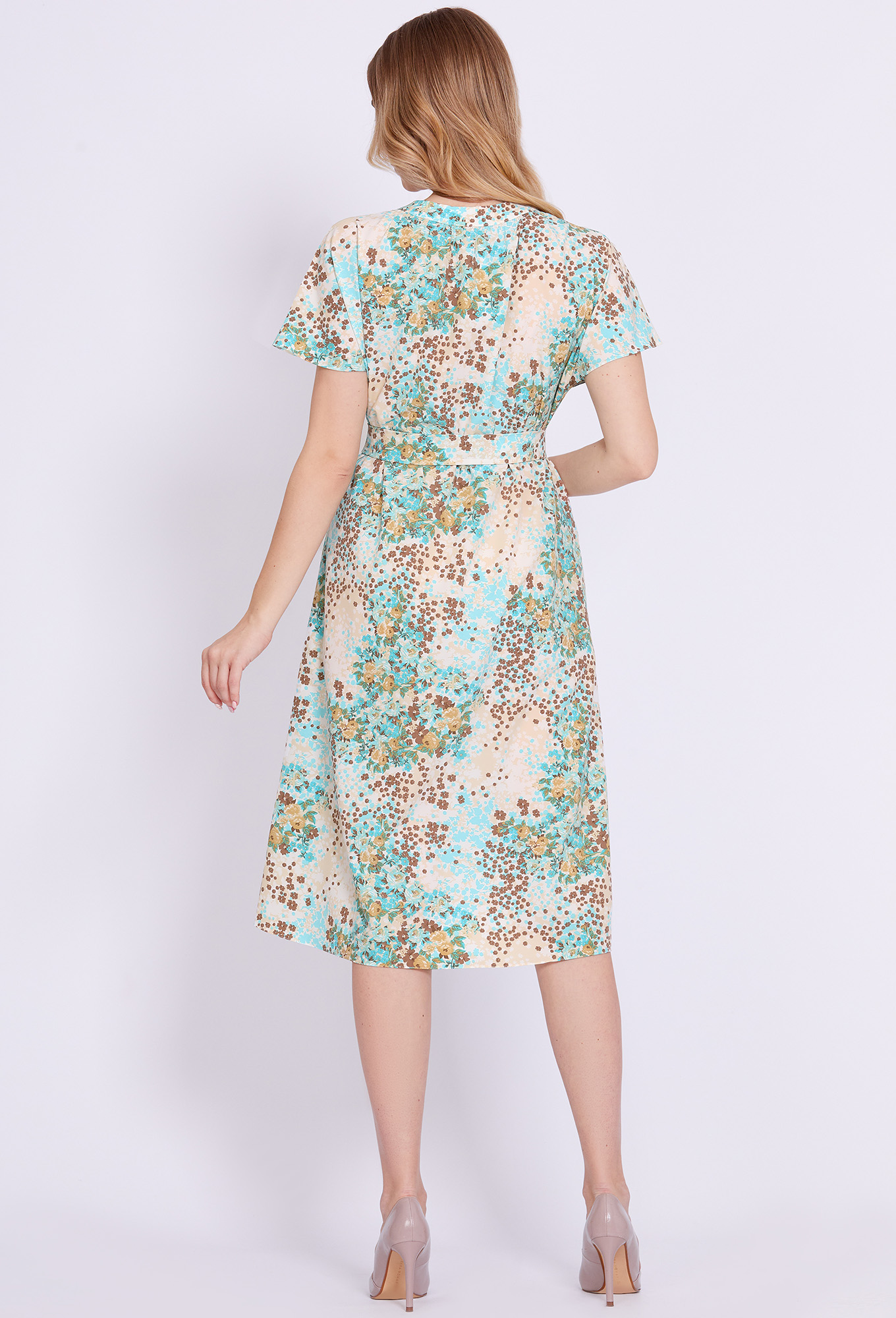 Нежное, легкое, комфортное платье А-образного силуэта, выполнено из мягкой, приятной ткани с акварельным цветочным принтом. Модель, с цельнокроеными рукавами, V-образным вырезом горловины, фигурным воротником-стойкой и функциональными карманами в боковых швах, дополнили интересным элементом по горловине спинки в виде сборки на венгерку в несколько рядов. Чтобы сделать платье еще более эффектным – линию талии подчеркнули стильным поясом-ремнем с пряжкой.