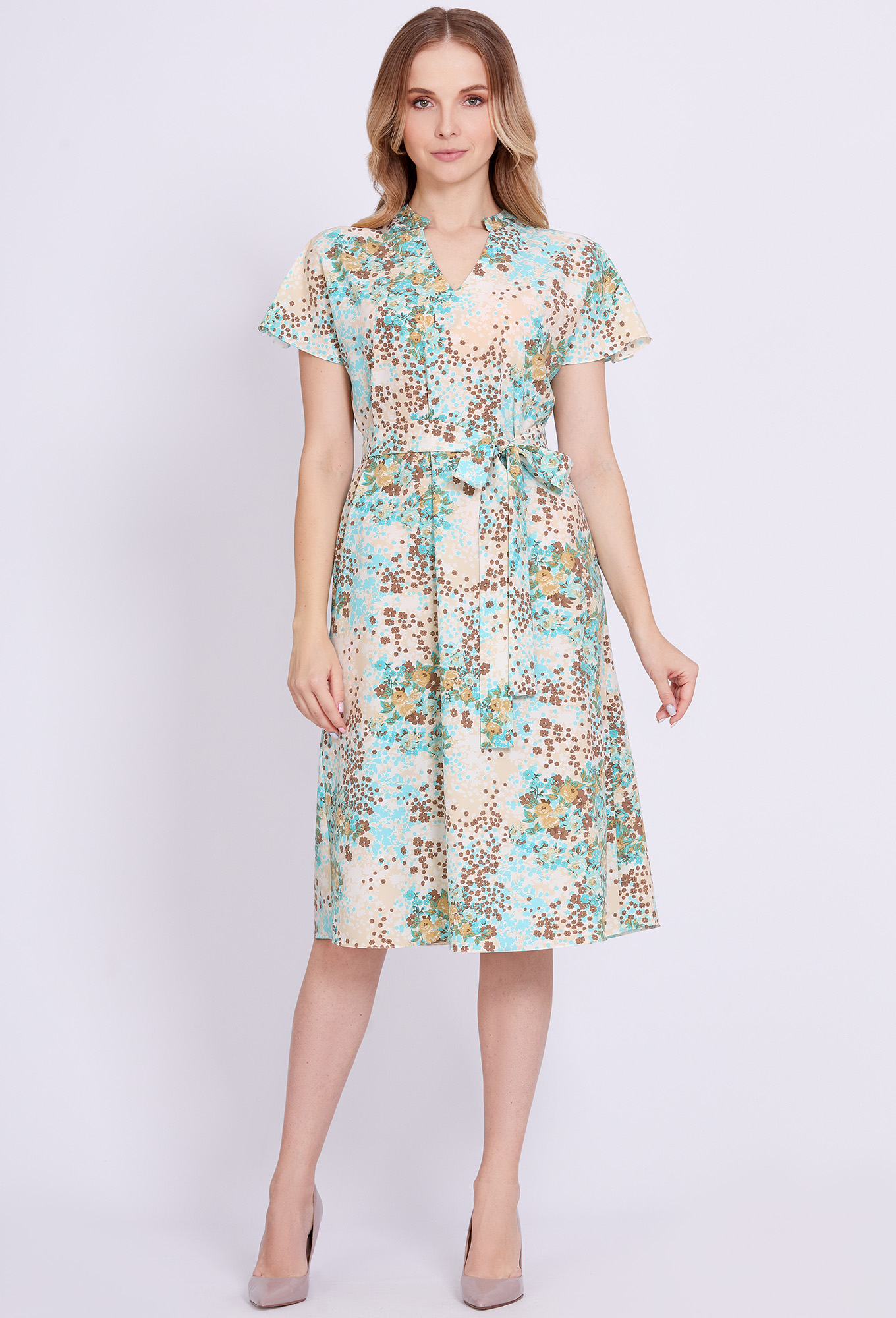 Нежное, легкое, комфортное платье А-образного силуэта, выполнено из мягкой, приятной ткани с акварельным цветочным принтом. Модель, с цельнокроеными рукавами, V-образным вырезом горловины, фигурным воротником-стойкой и функциональными карманами в боковых швах, дополнили интересным элементом по горловине спинки в виде сборки на венгерку в несколько рядов. Чтобы сделать платье еще более эффектным – линию талии подчеркнули стильным поясом-ремнем с пряжкой.