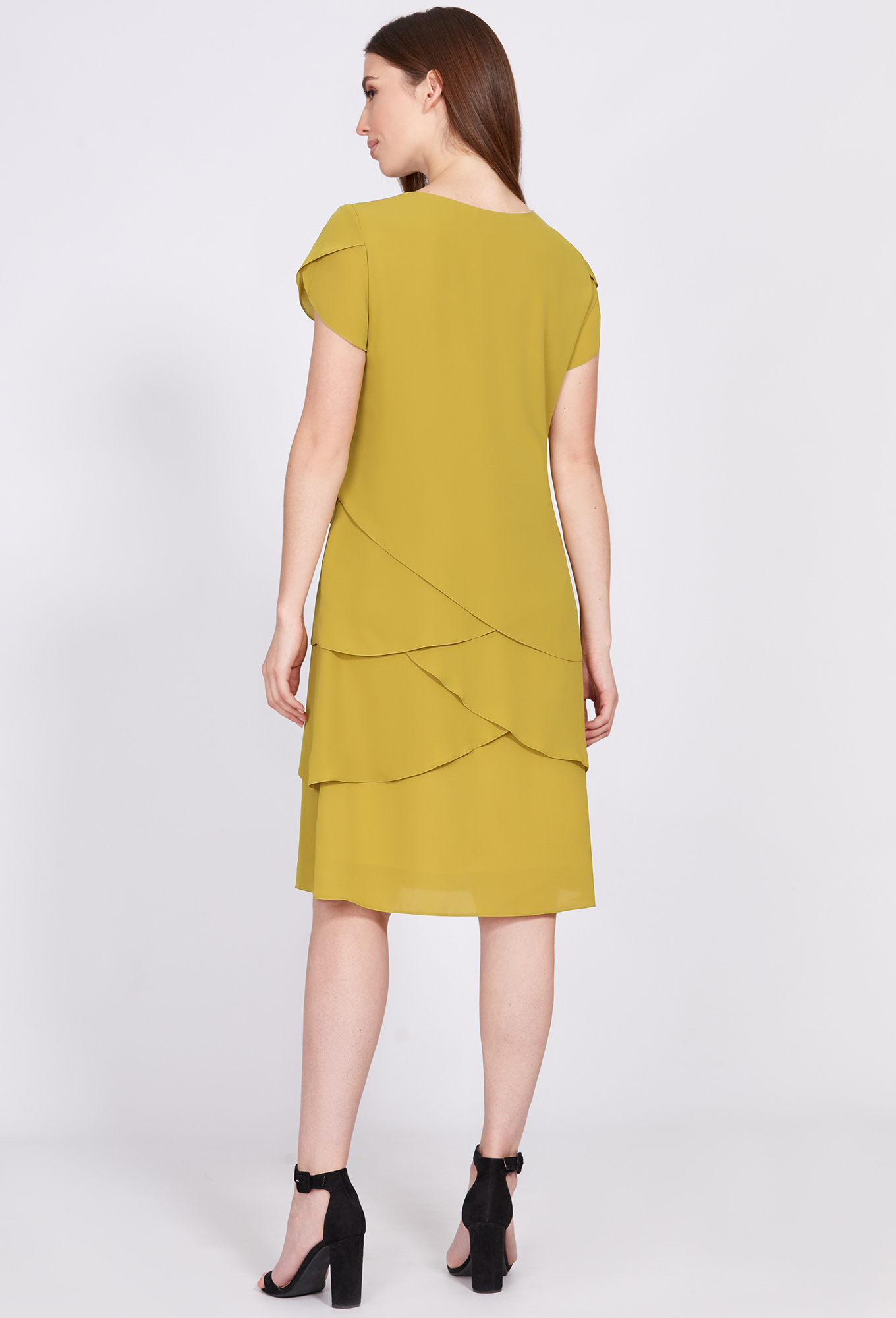 Это элегантное платье подойдёт для любого важного события – свадьбы, юбилея или торжественного ужина. Модель А-образного силуэта с округлым вырезом горловины и короткими воздушными рукавами. Платье украшено асимметричными оборками, которые мягко развеваются во время движения, придавая силуэту динамичность и лёгкость. Изделие сшито из мягкой однотонной ткани и приятной подкладки, обеспечивающей должное удобство при ношении.