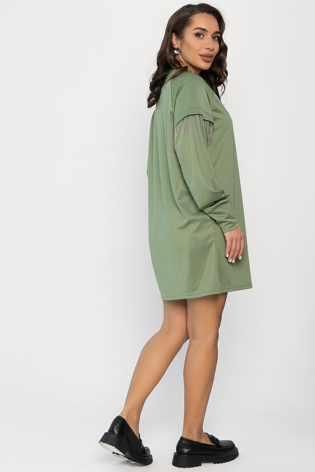 Трикотажное платье свободного кроя — это отличный выбор для создания стильного и комфортного образа! Его отличительной чертой является эффектная металлическая бахрома, которая придаёт ему оригинальности. Модель оснащена удобными боковыми карманами. Элегантные рукава с высокой манжетой не только добавляют образу изысканности, но и защищают от холода.