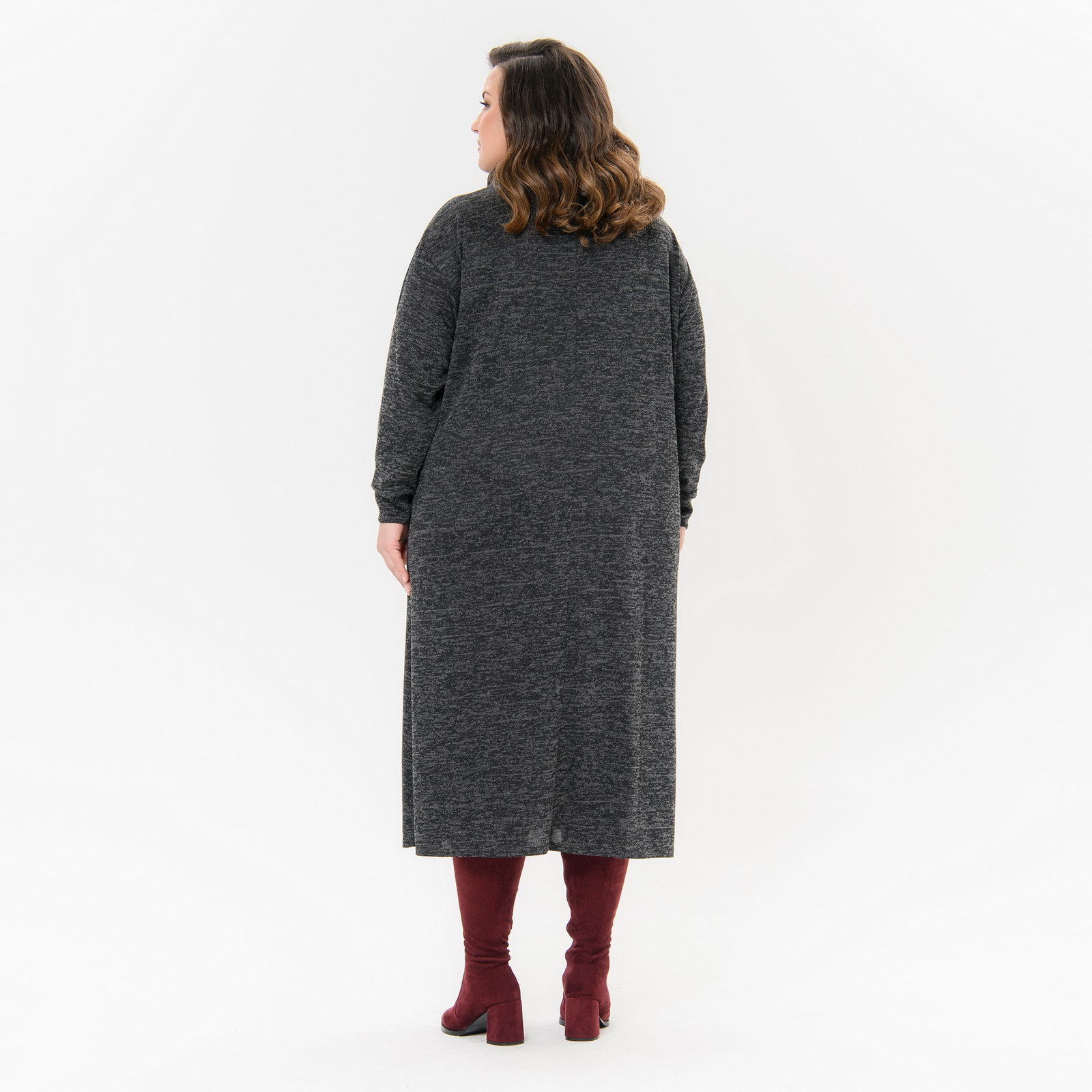 Платье свободного силуэта, слегка расклешенное к низу за счет боковых швов, из джерси-меланжа. Линия плеча спущена, рукав длинный, на манжете.