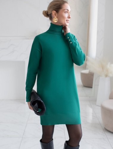 Платье тонкой вязки выполнено из хлопка. Лаконичная модель с высоким воротом как у водолазки дополнена манжетами с золотистыми пуговицами. Изделие свободно сидит по фигуре и не сковывает движений. Мягкая пряжа очень приятная к телу не колется и сохраняет тепло при этом не перегревая.