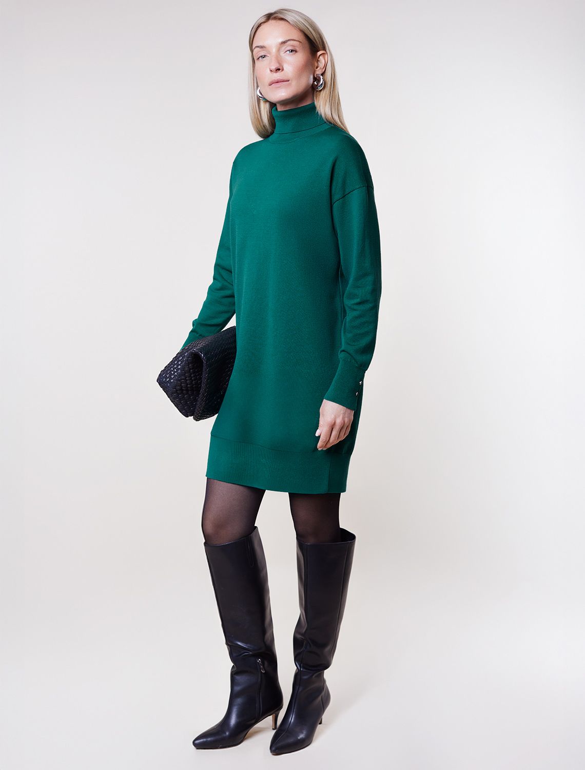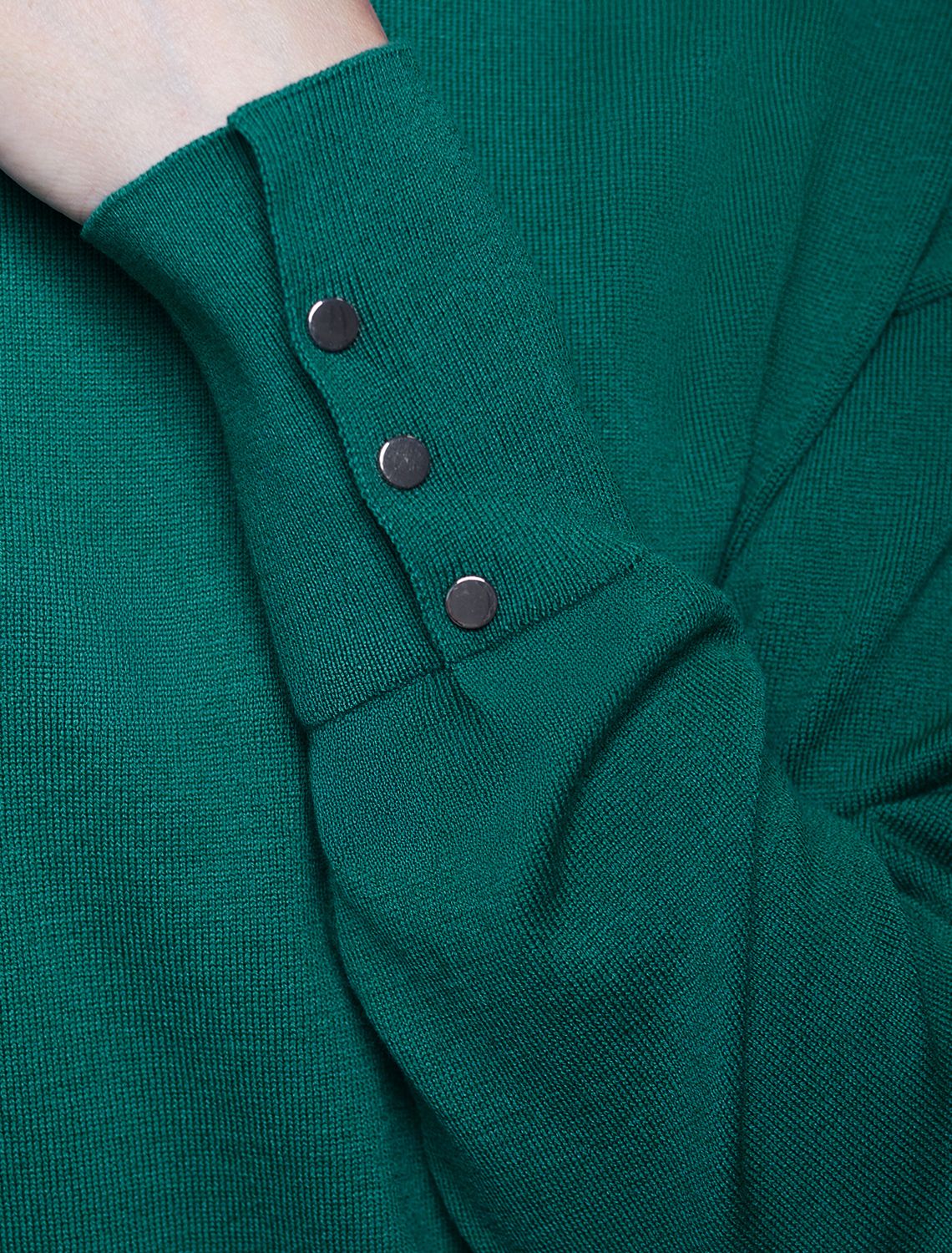 Платье тонкой вязки выполнено из хлопка. Лаконичная модель с высоким воротом как у водолазки дополнена манжетами с золотистыми пуговицами. Изделие свободно сидит по фигуре и не сковывает движений. Мягкая пряжа очень приятная к телу не колется и сохраняет тепло при этом не перегревая.