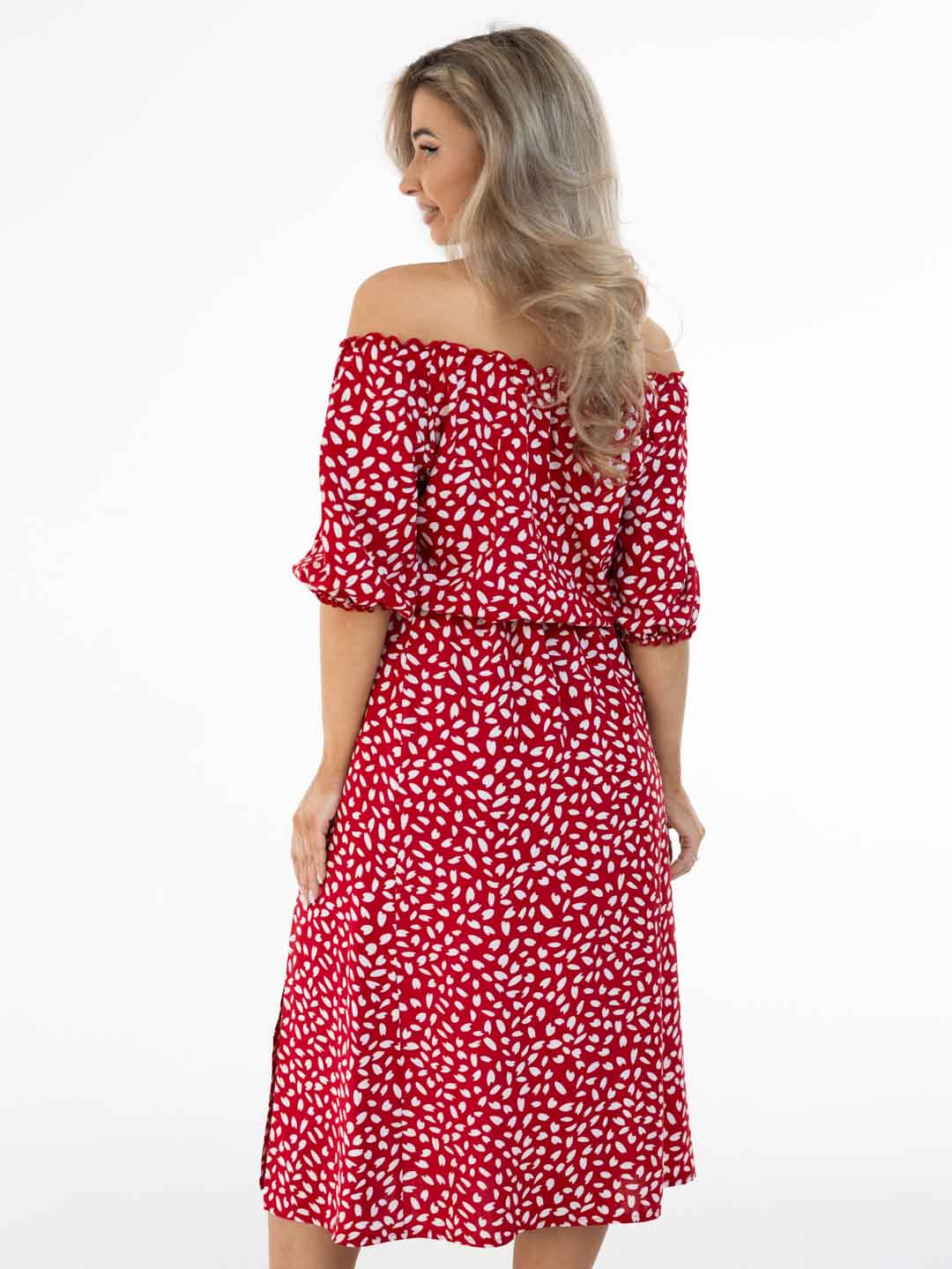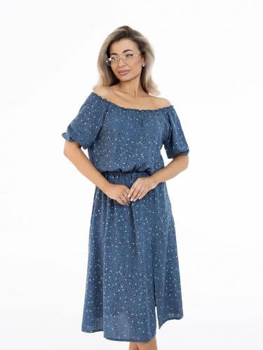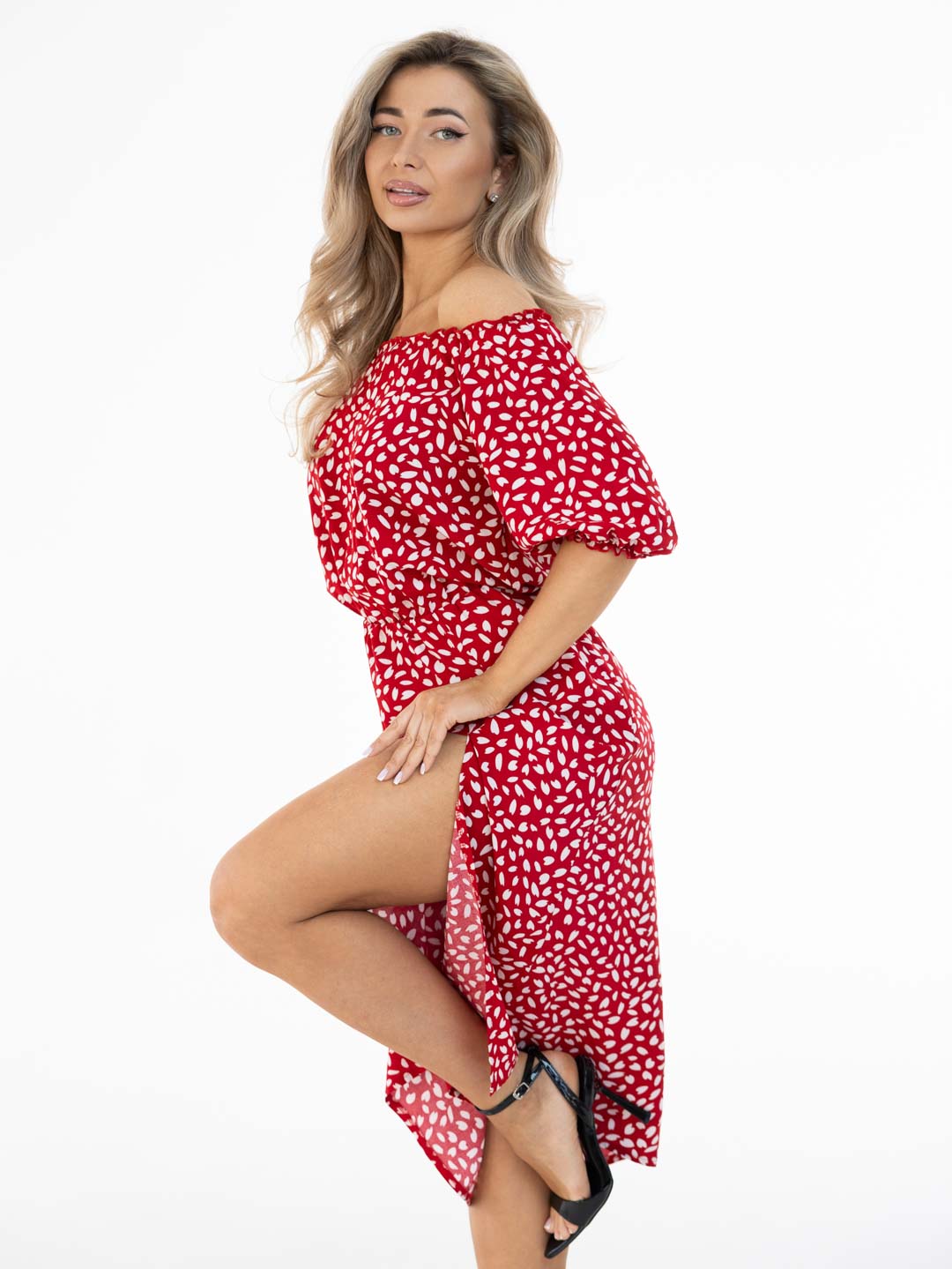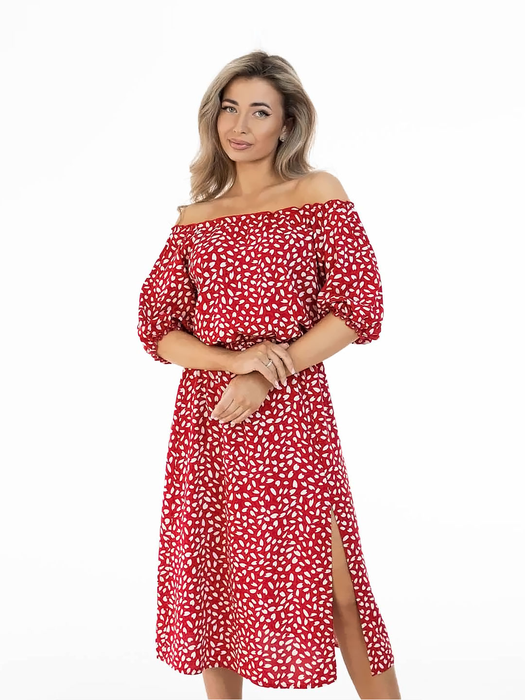 Платье женское с резинкой по горловине и талии, рукав фонарик, юбка с высоким разрезом по ноге, длиной миди. Женское платье из штапеля незаменимо в летнее, весеннее и осеннее время года. Такая модель смотрится прекрасно на любой фигуре, скрывает недостатки и подчеркивая талию. Платье легко комбинируется с любой другой одеждой: косухой, джинсовкой, тренчем.