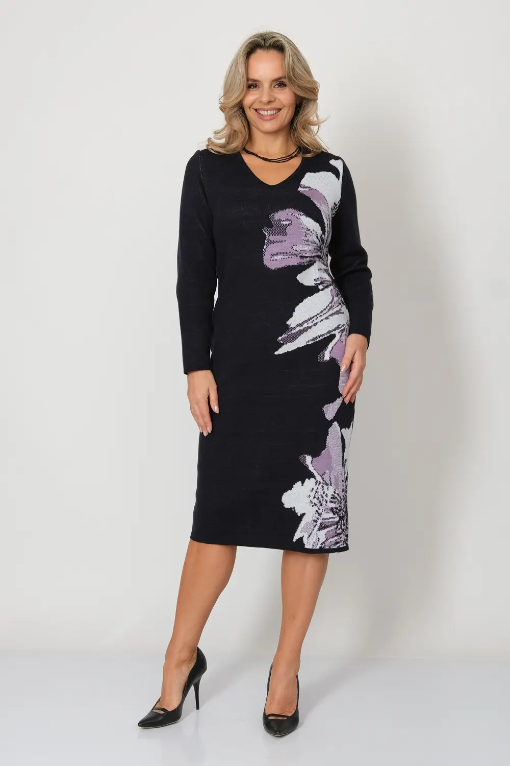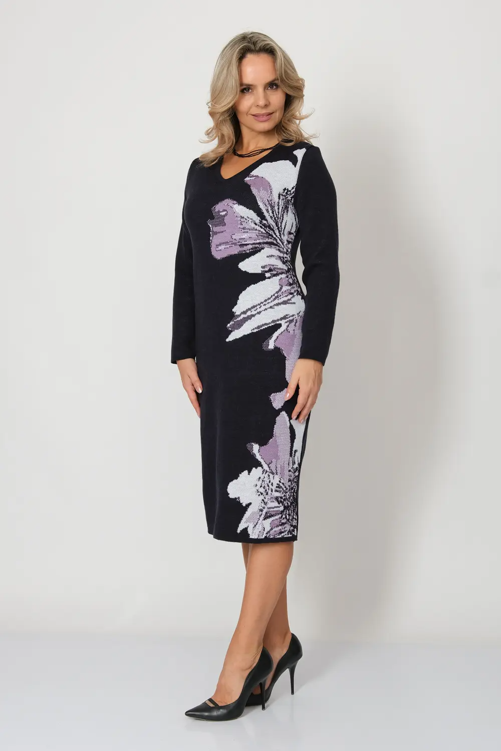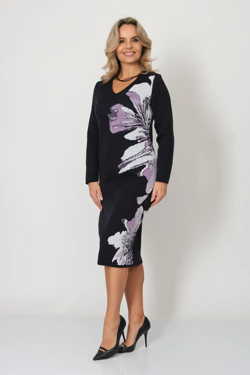 Вязаное эффектное платье полуприлегающего силуэта. Рукава втачные длинные. Горловина круглая, обработана бейкой. Жаккардовое переплетение. Платье выгодно подчеркнет Вашу фигуру и  согреет Вас прохладной погодой. сине-лиловый