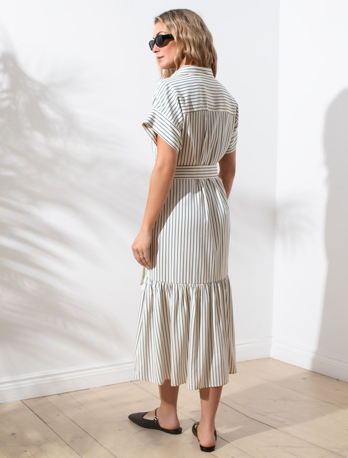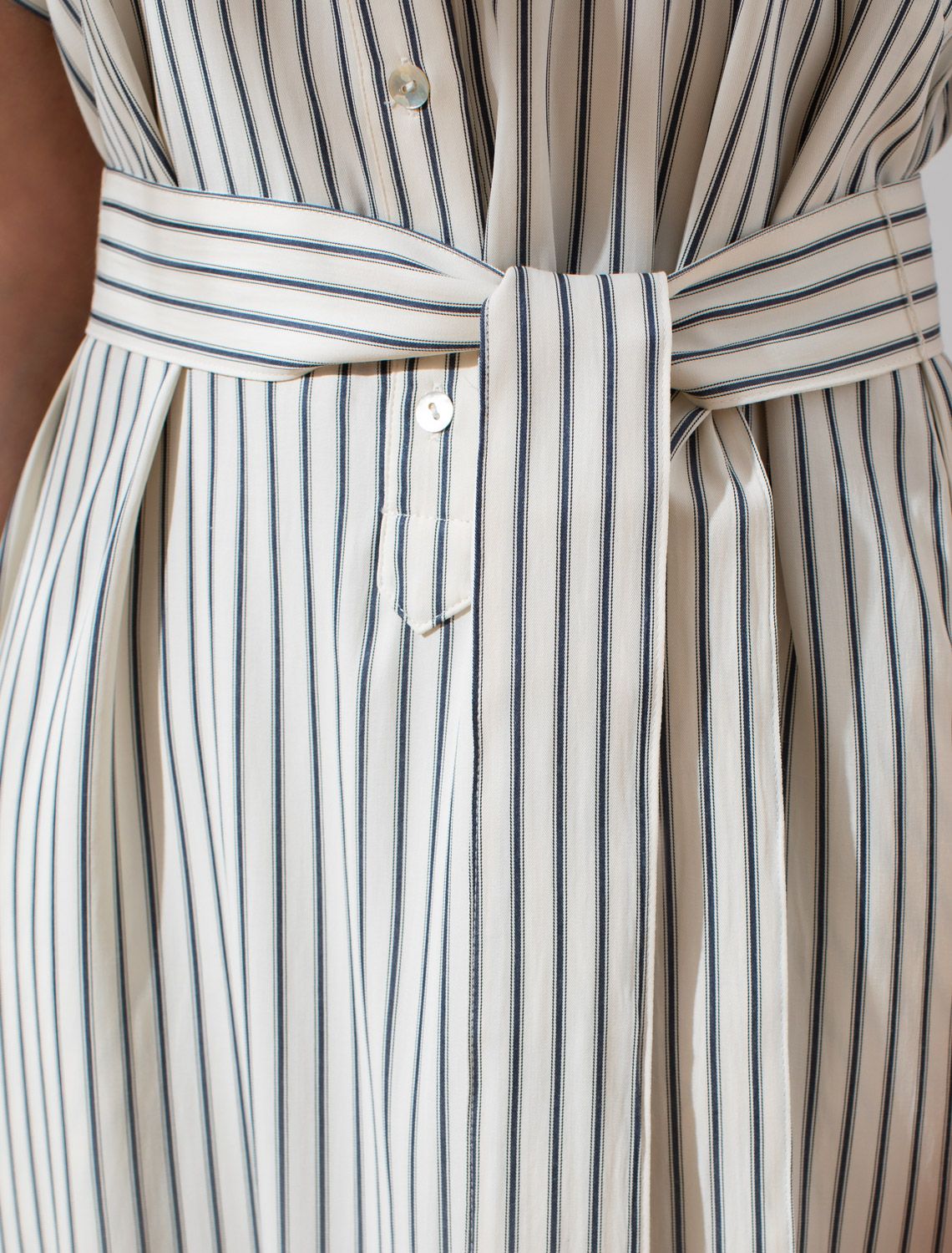Платье А-силуэта с поясом молочного цвета в тоную синюю вертикальную полоску выполнено из легкого хлопкового поплина плотностью 112 Г/м2. Воздушное платье с застежкой на пуговицы с пышной юбкой-воланом отличный вариант для теплой и жаркой погоды. Модель обладает красивым кроем, который придает образу женственность и элегантность. Отложной воротничок и короткий цельнокроеный рукав с широкой манжетой создают стильный акцент, подходящий для повседневного ношения и различных ситуаций. Талия подчеркнута поясом, который легко регулируется и подчеркивает силуэт, придавая особый шарм и аккуратность образу. Натуральный состав ткани обладает высокой воздухопроницаемостью, а также способностью поглощать и отдавать влагу. В повседневном платье будет очень комфортно, благодаря правильной регуляции температуры тела. Такая модель подходит на маленький и высокий рост, а так же на любую фигуру, позволяя подчеркнуть достоинства и скрыть возможные недостатки, так же принт в тонкую вертикальную полоску визуально стройнит и вытягивает силуэт. Это длинное платье отлично подойдет тем, кто ценит удобство и утонченность в одежде из качественной вискозы и хлопка. Красивое легкое платье прекрасно подходит для динамичного рабочего дня, городских прогулок или торжественных мероприятий, его легко адаптировать под разные ситуации и стили.