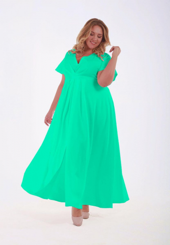 Элегантное длинное вечернее платье из эластичного крепа ментолового цвета. V-образный вырез и разрез спереди широкой юбки придают платью особый шик.