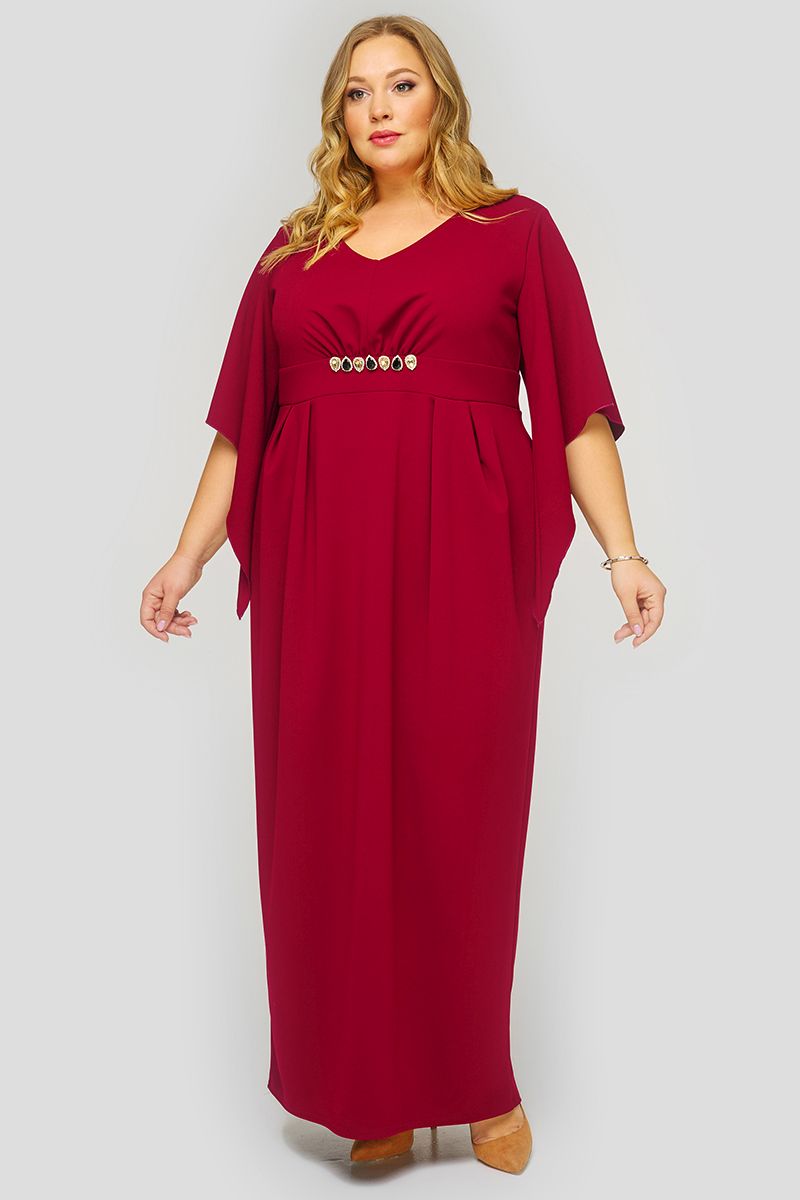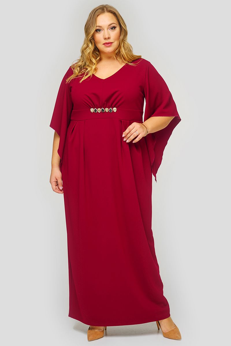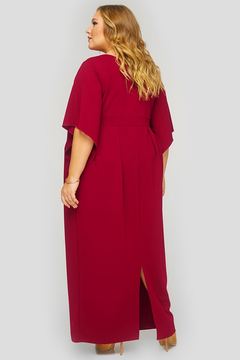 Вечернее платье полуприлегающего силуэта. V-вырез горловины по переду и по спинке. Рукав в виде "крыла" заканчивается углом по нижнему шву. Верхняя часть отрезная, на подкладке, со сборкой по центру переда под линией груди. Двойной втачной пояс. Юбка "тюльпан" с разрезом по центральному шву задней половинки.