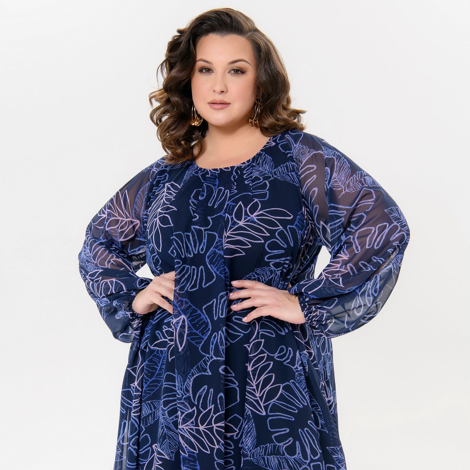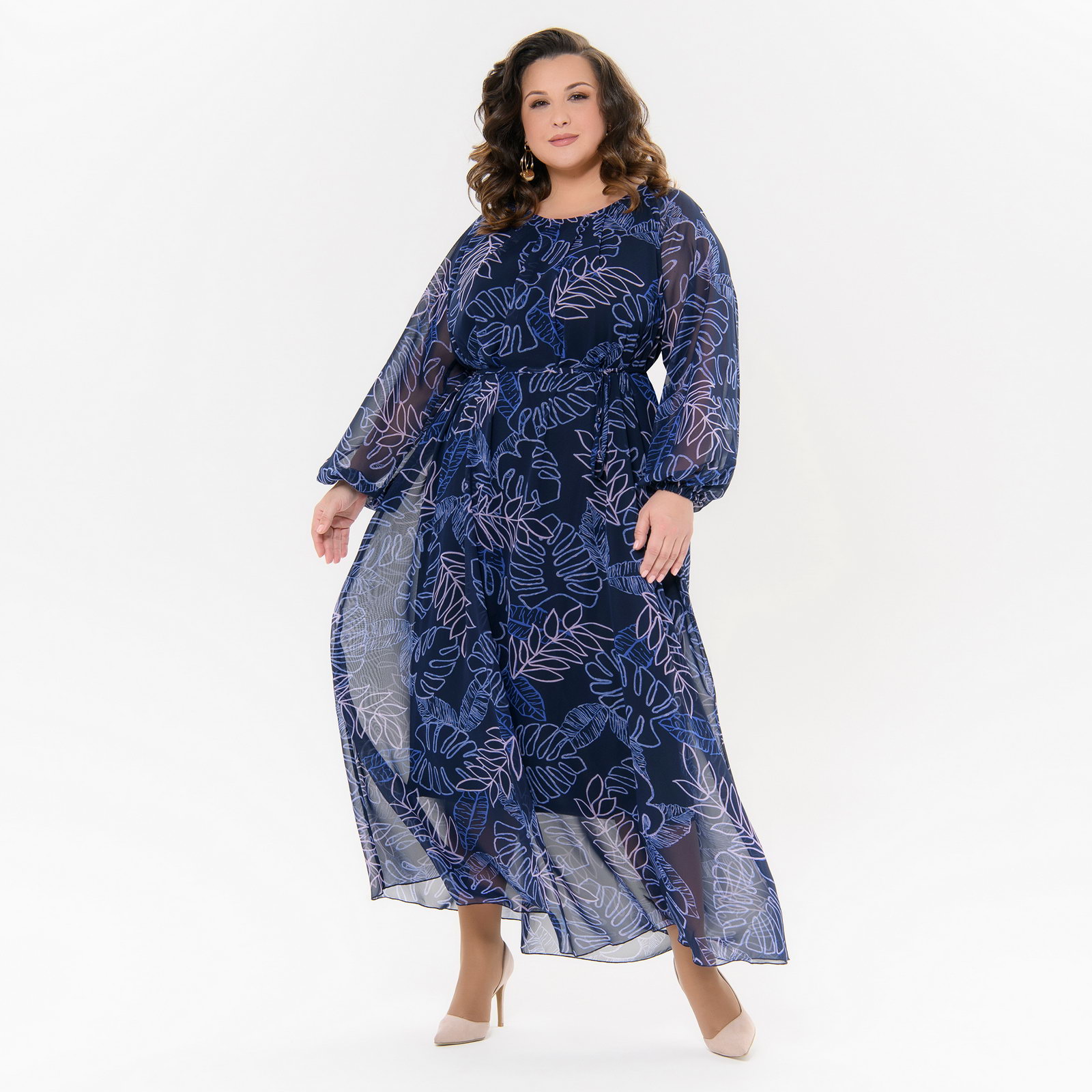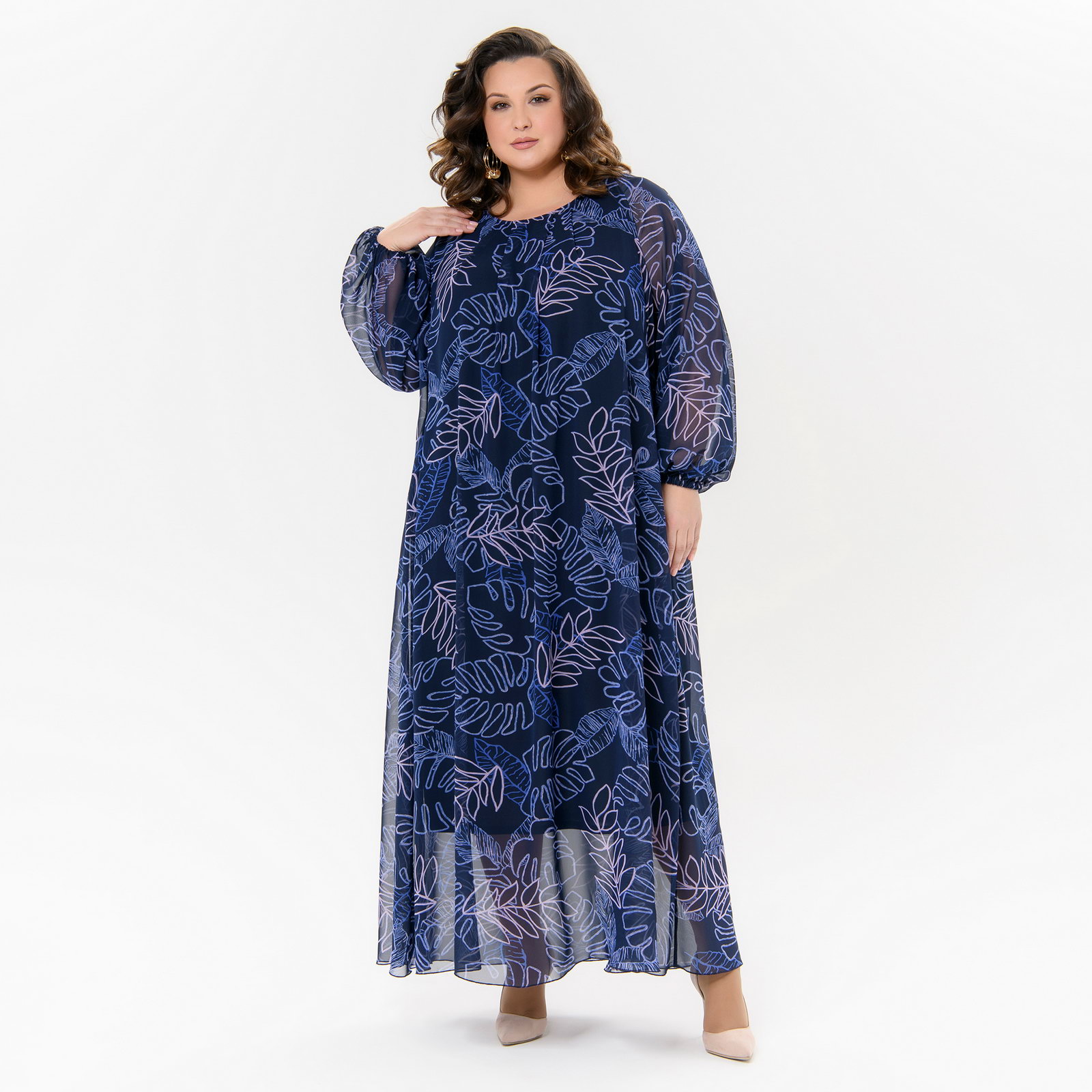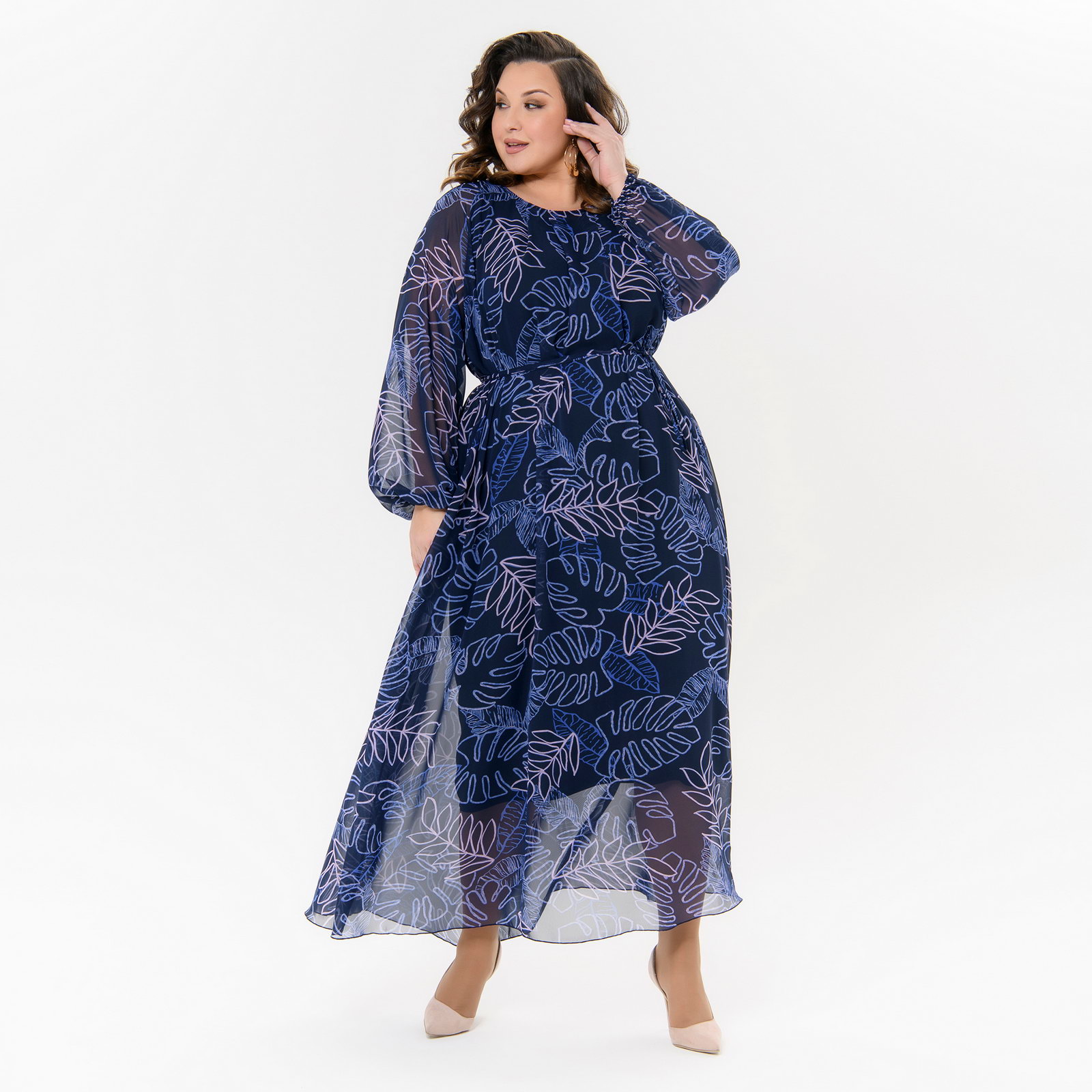 Платье вечернее из шифона, темно-синее, принт "роскошный"