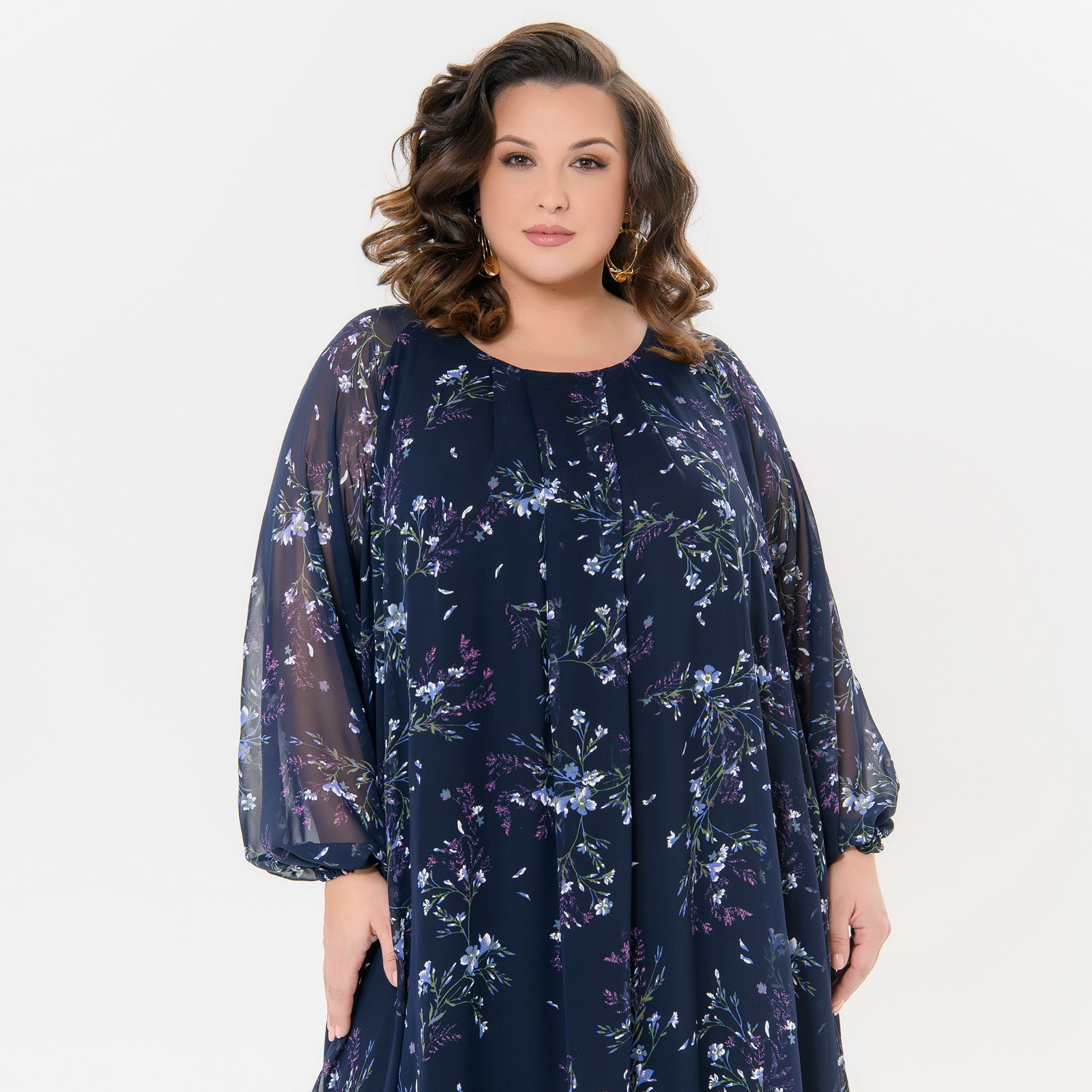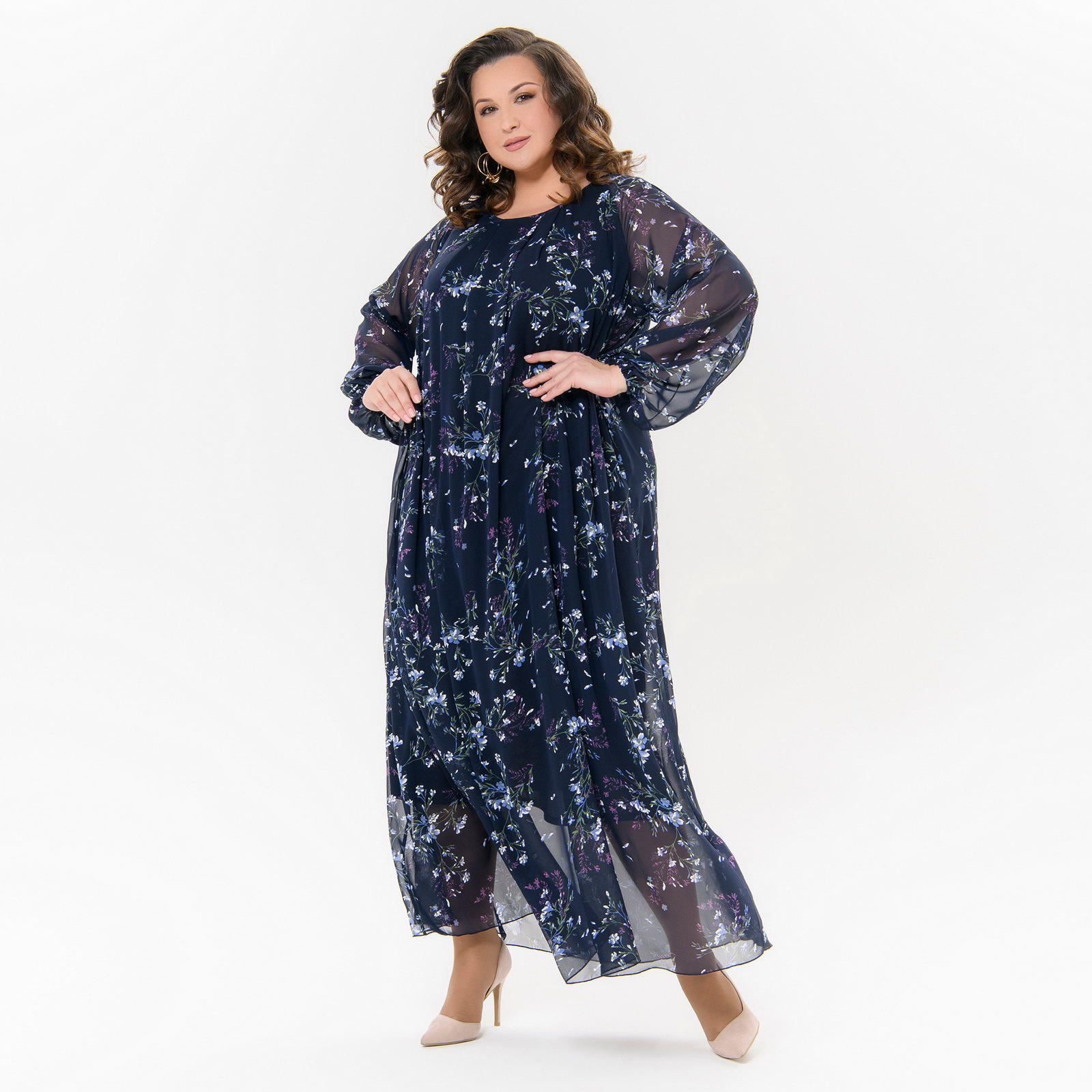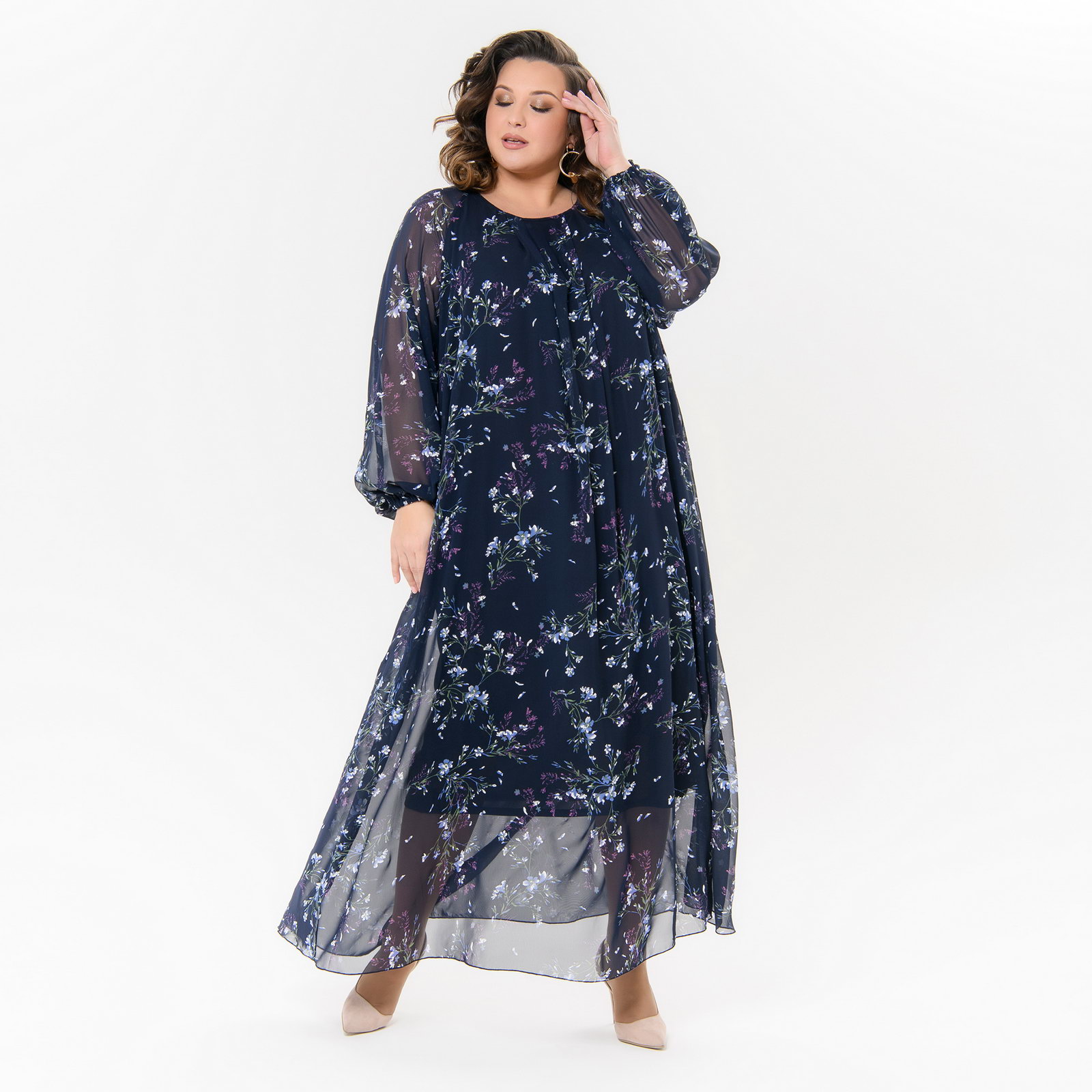 Платье вечернее из шифона, темно-синее, принт "васильковые цветы"