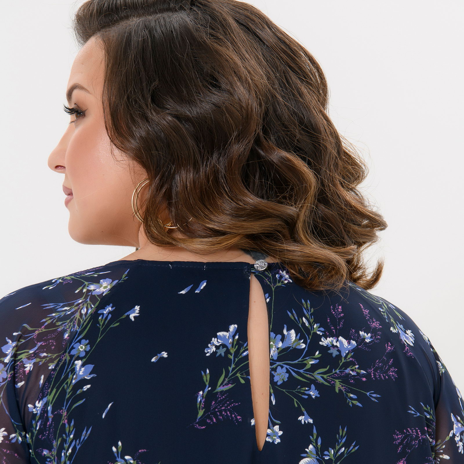 Модель выполнена на подкладке из эластичного трикотажа. Горловина округлая с мягкими складочками по переду, по спинке вырез "капелька", застегивающийся на пуговицу.