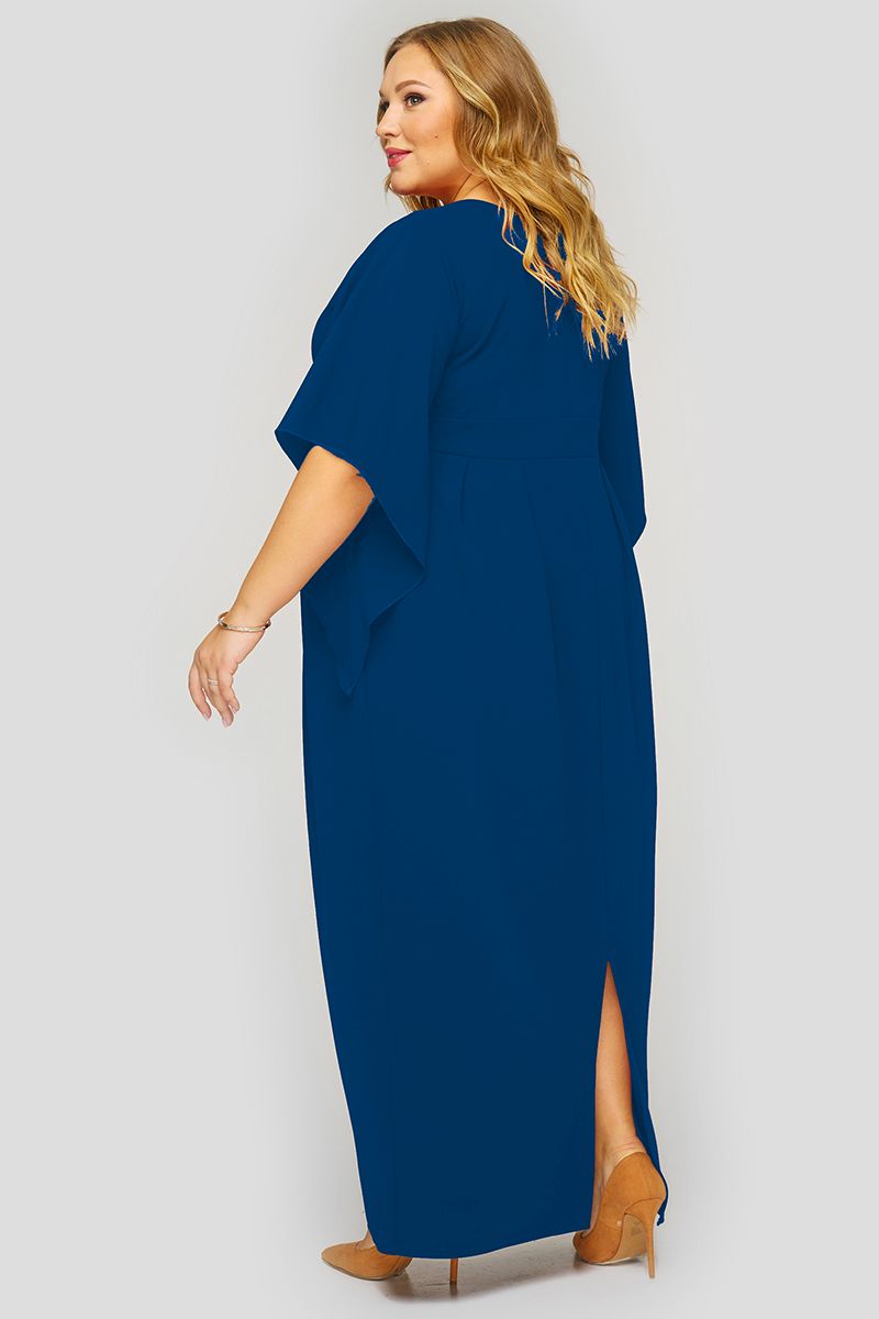Вечернее платье полуприлегающего силуэта. V-вырез горловины по переду и по спинке. Рукав в виде "крыла" заканчивается углом по нижнему шву. Верхняя часть отрезная, на подкладке, со сборкой по центру переда под линией груди. Двойной втачной пояс. Юбка "тюльпан" с разрезом по центральному шву задней половинки.