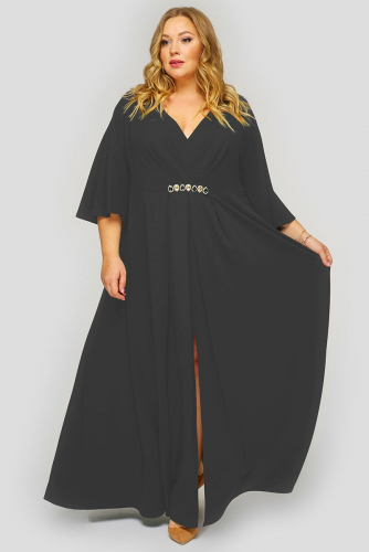 Платье длинное из трикотажа. V-образный вырез горловины, отрезное под грудью, широкий цельнокроенный рукав. По нижней части платья подклад до разреза из основной ткани. По центру юбки переда- разрез.