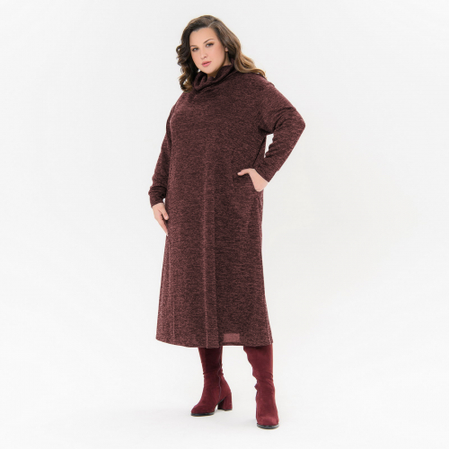 Платье длинное из трикотажа. V-образный вырез горловины, отрезное под грудью, широкий цельнокроенный рукав. По нижней части платья подклад до разреза из основной ткани. По центру юбки переда- разрез.