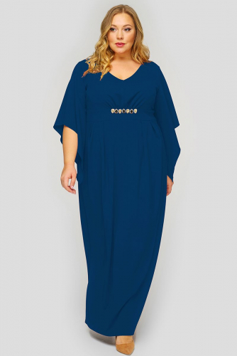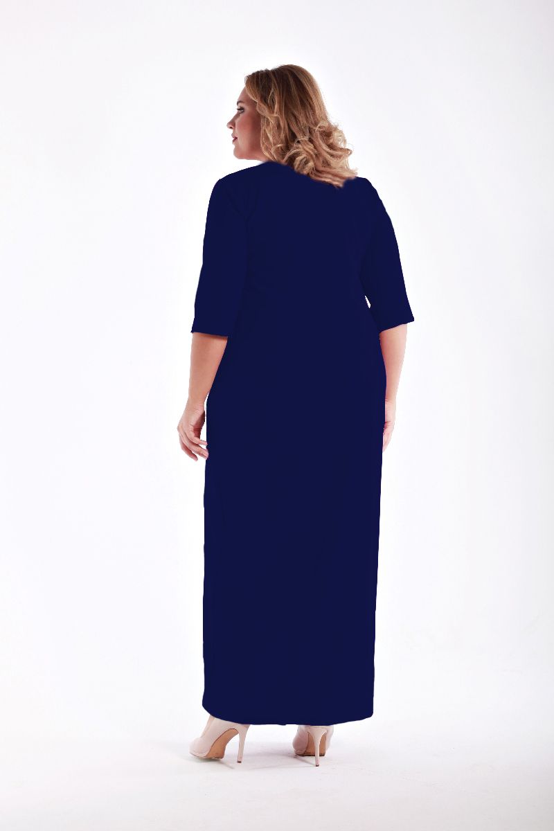 Вечернее платье из крепа с эластаном темно-синего цвета. Верхняя часть отрезная по линии талии. По переду оригинальная драпировка. На уровне левого рельефа передней части юбки разрез. Рукав 3/4.