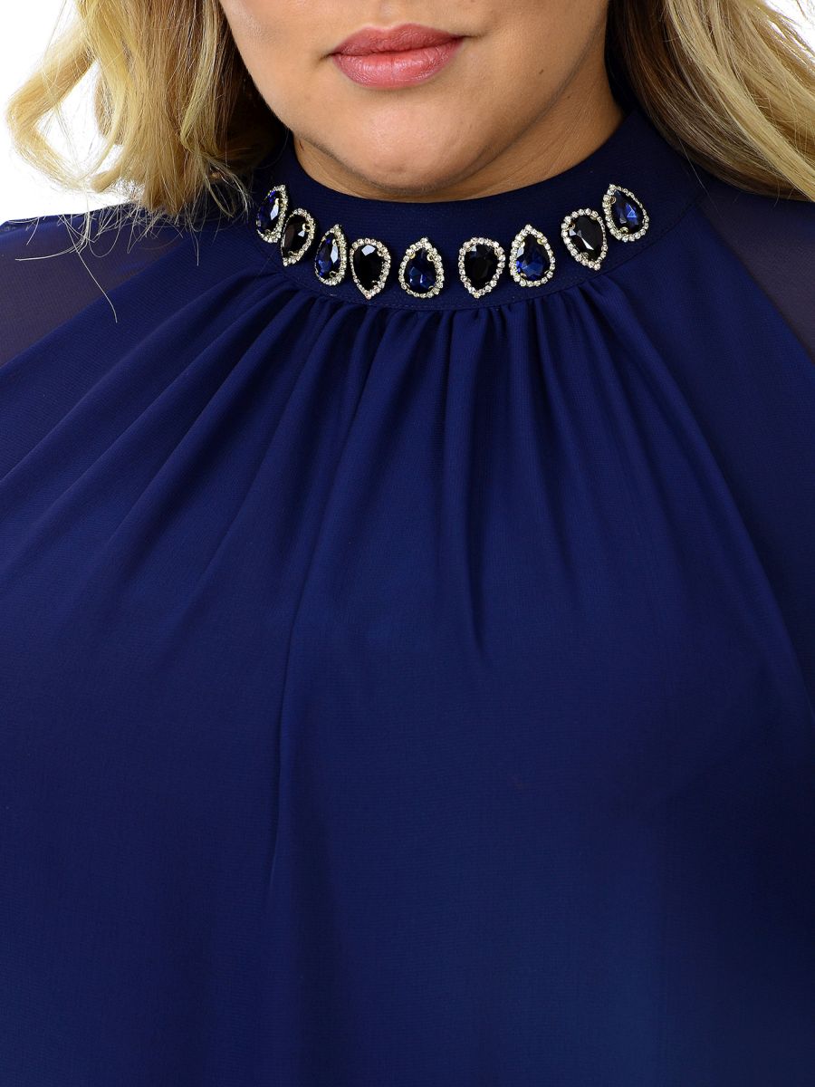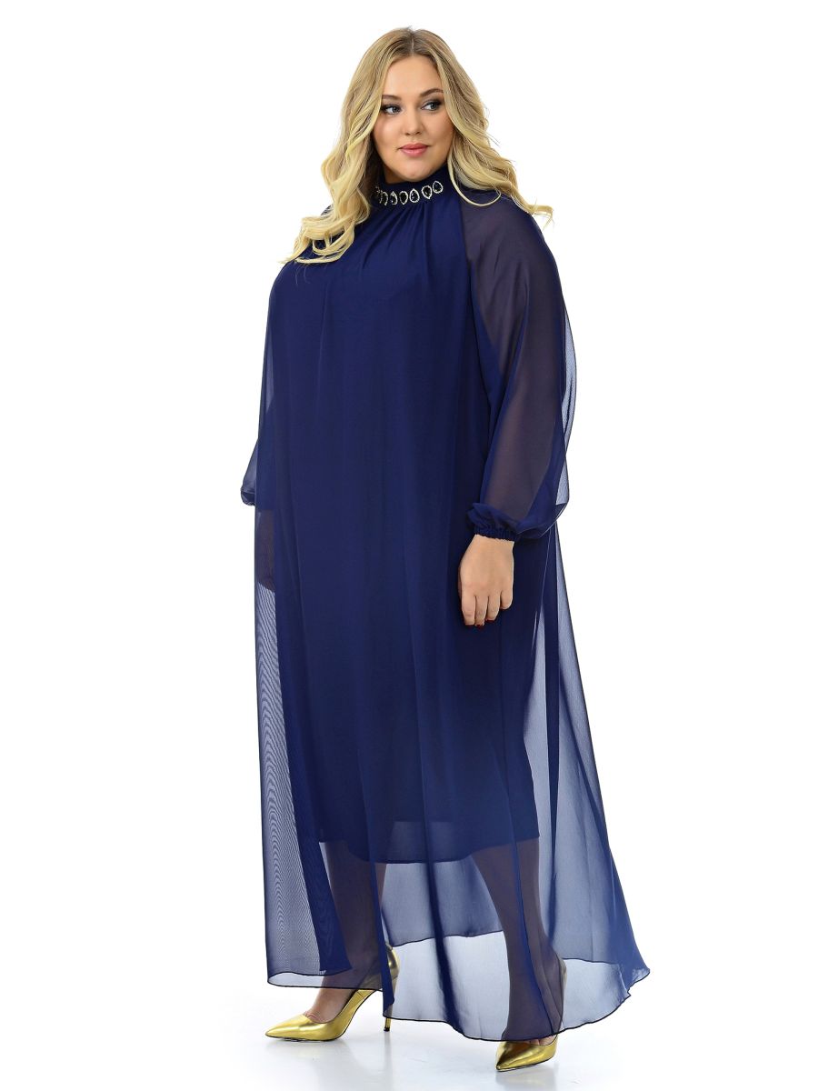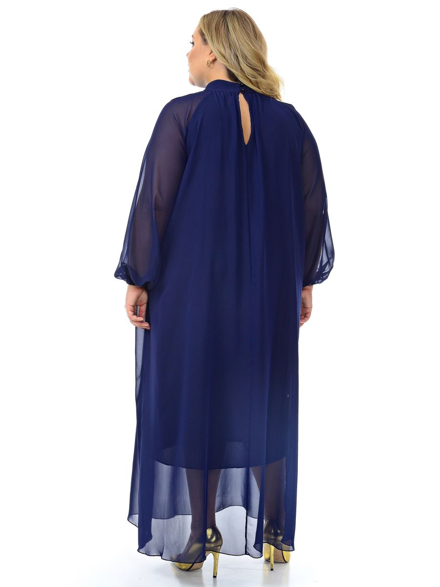 Вечернее платье с рукавом реглан. Модель выполнена из шифона на подкладке из эластичного трикотажа. Воротник-стойка дополняется вырезом "капля" на спинке и двумя пуговицами.