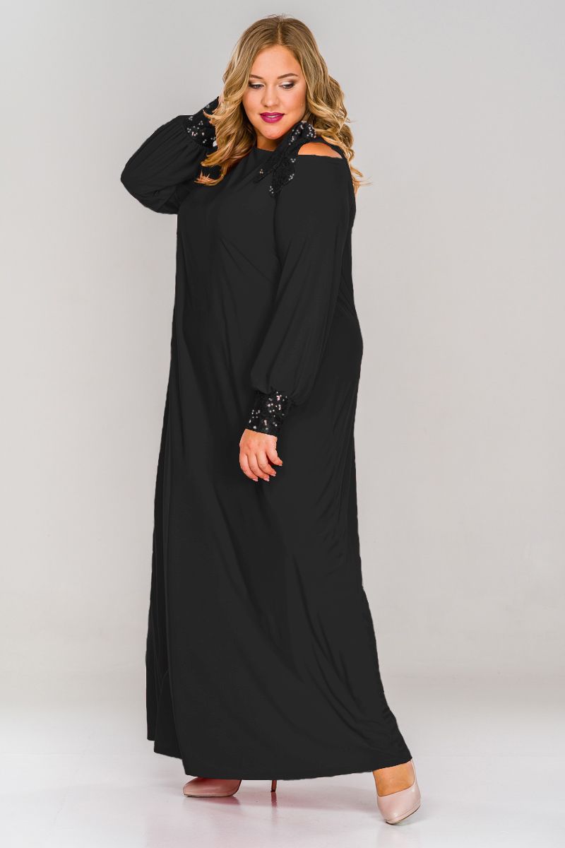 Вечернее платье свободного силуэта с длинными рукавами. Открытое плечо украшает бретель из пайеток.
