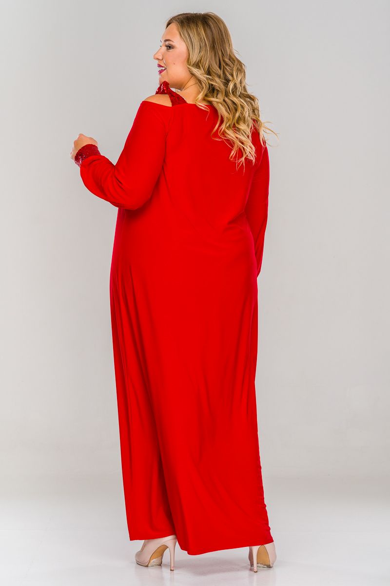 Вечернее платье свободного силуэта с длинными рукавами. Открытое плечо украшает бретель из пайеток.