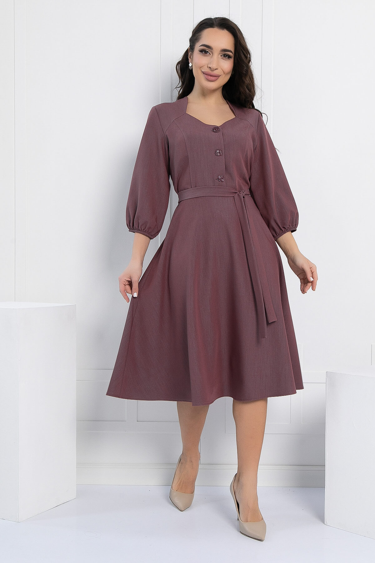 Превосходный выбор для тех, кто стремится к элегантности и утончённости. Модель с юбкой-клеш и рукавами длиной 3/4, которые оканчиваются резинкой, создаст женственный и изысканный образ. Талия платья отрезная, а по переду предусмотрена застёжка на пуговицы. Фигурный вырез горловины придаёт платью особый шарм. Пояс из основной ткани, который входит в комплект, подчёркивает талию, делая образ завершённым и стильным. Это платье станет отличным выбором для вечерних мероприятий и торжеств, позволяя вам выглядеть безупречно в любой ситуации.