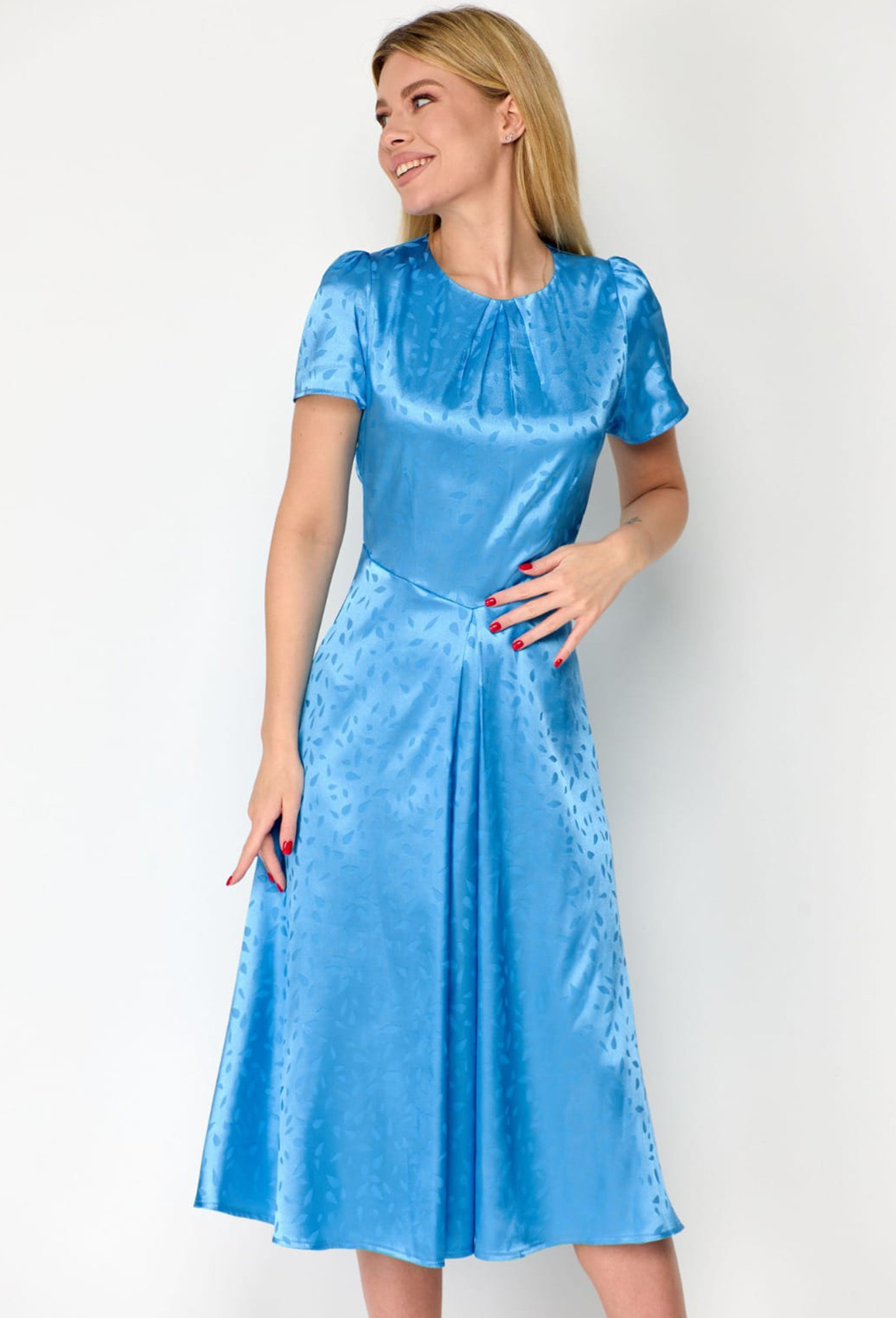 Платье женское, отрезное по линии талии с втачными короткими рукавами. По окату рукава обработано сборка. По переду обработаны талиевые вытачки и декоративные складки по горловине. Нижняя часть платья расширенная, по переду заложено широкая встречная складка. Спинка со средним швом в котором обработана потайная тесьма молния И таливые вытачки по спинке. Горловина обточная, низ рукавов и платья подогнут и закреплён отделочной строчкой.