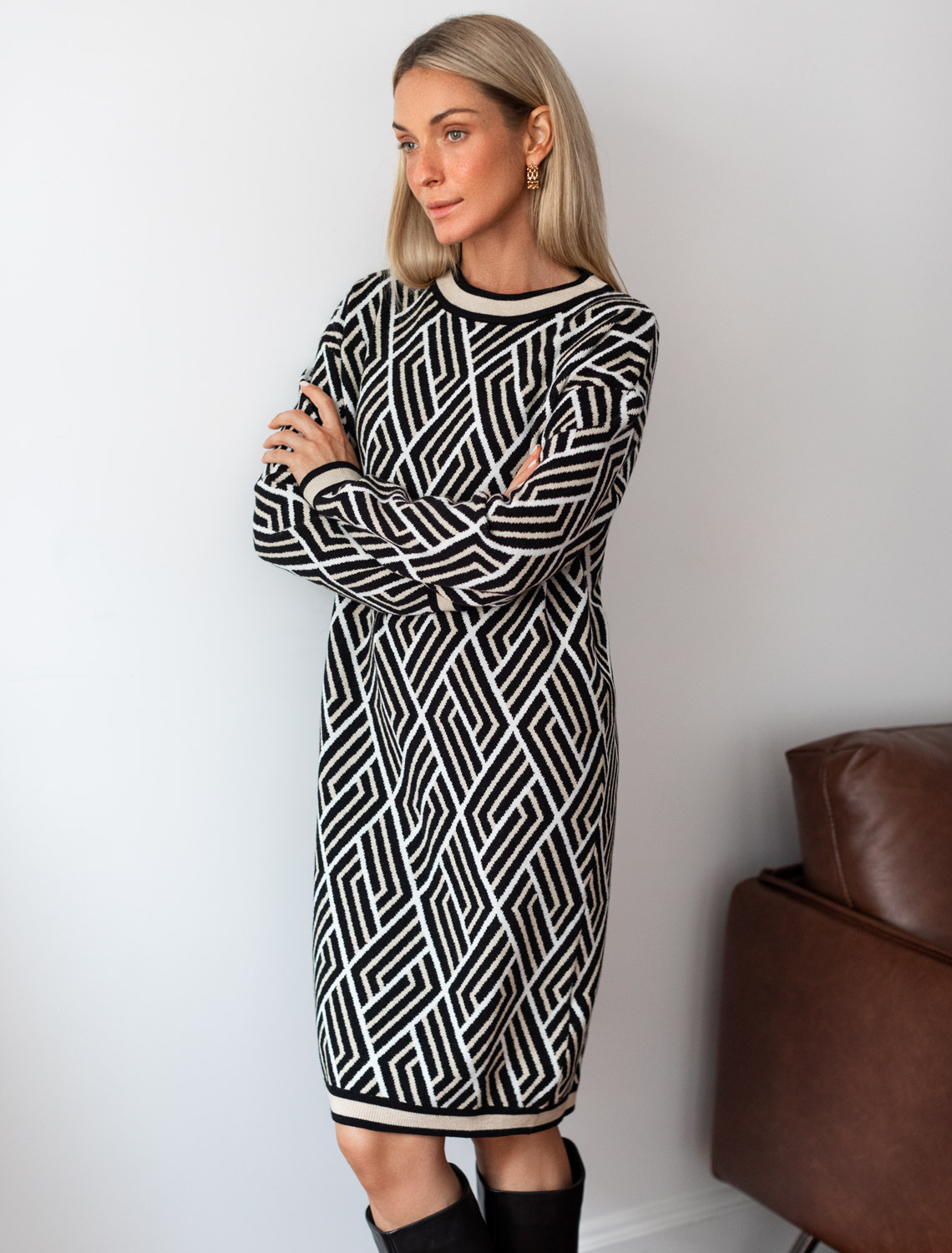 Платье жаккардовой вязки выполнено из мягкой пряжи на основе вискозы с добавлением кашемира. Модель свободного силуэта подходит для любой фигуры. Нежная пряжа очень комфортно ощущается на теле, сохраняя оптимальное тепло при этом не перегревая. Совет стилиста: жаккардовое платье отличная инвестиция в базовый гардероб, которая поможет создать дорогие образы. Носите с высокими сапогами удлиняя силуэт или плотными колготками. черный-бежевый