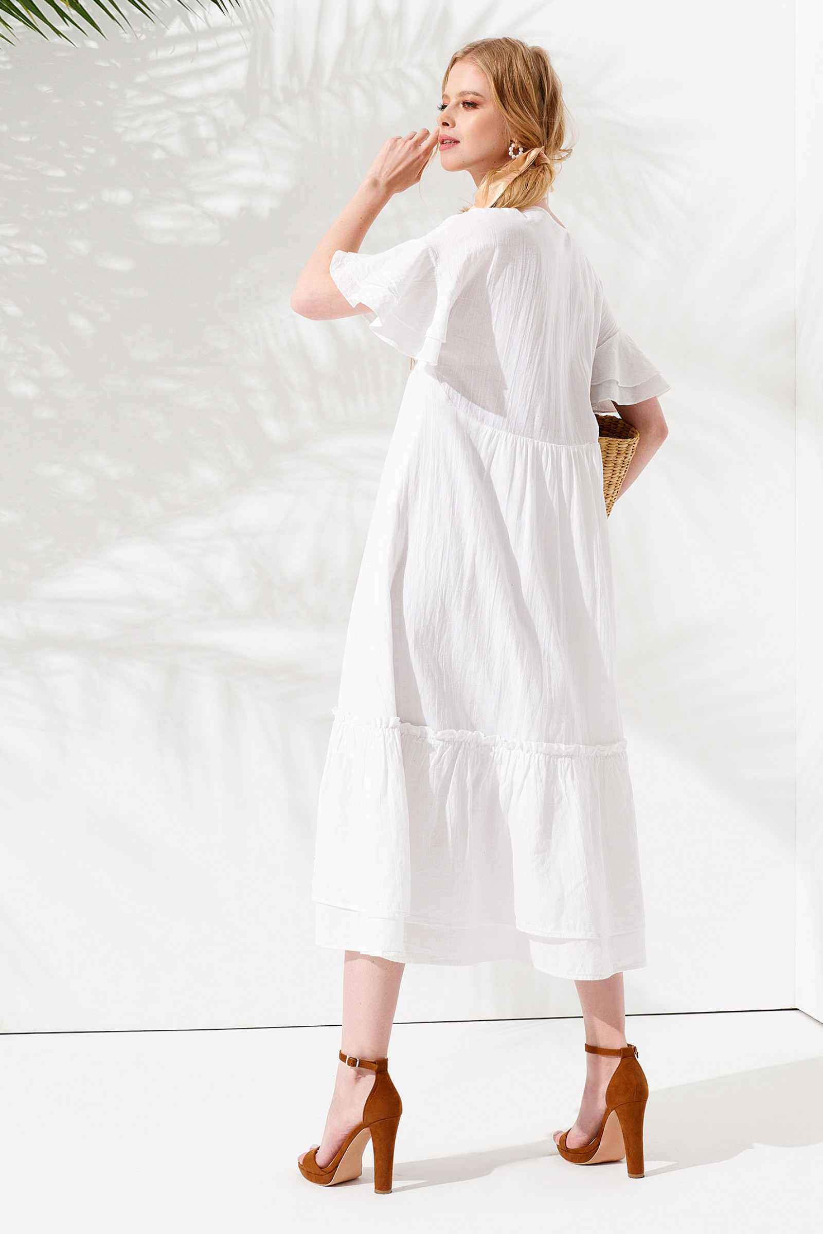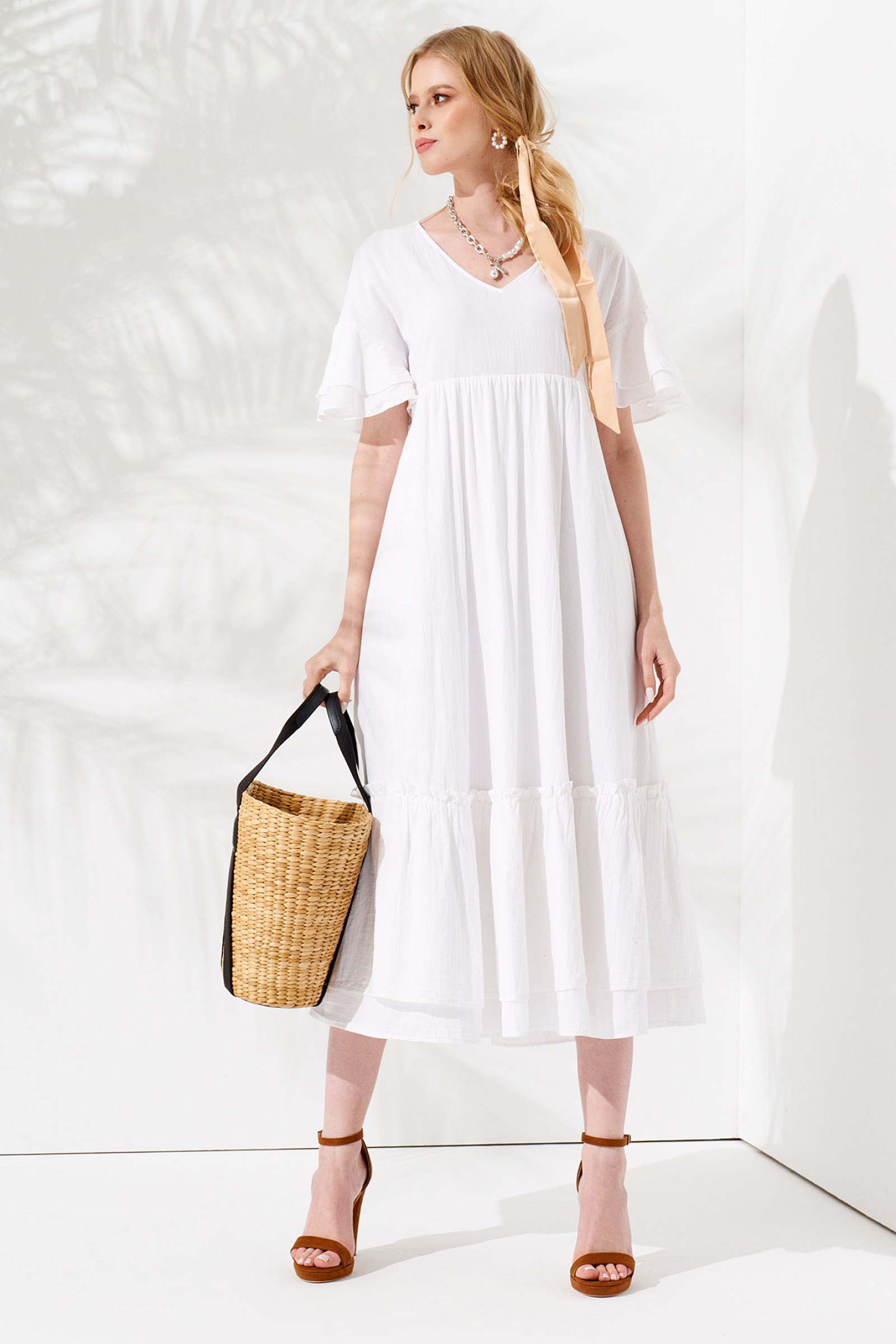 Женское платье свободного кроя безупречно садится по фигуре любого типа. Чуть завышенная линия талии с небольшими вертикальными защипами-складками при необходимости скроют выступающий животик и лишние сантиметры на бедрах. Длинное женское платье дополнено коротким рукавом и V-образным вырезом горловины. Роскошная юбка ложится красивыми волнами, открывая изящные щиколотки.