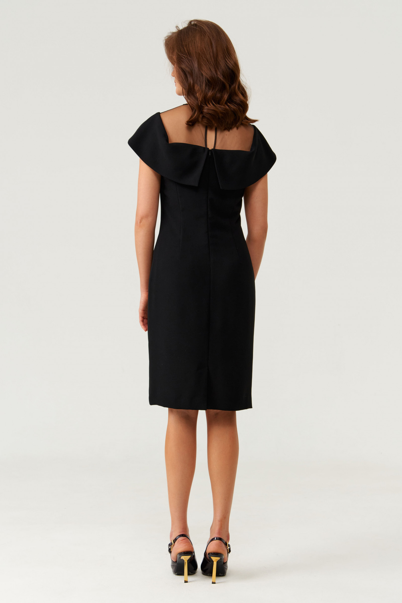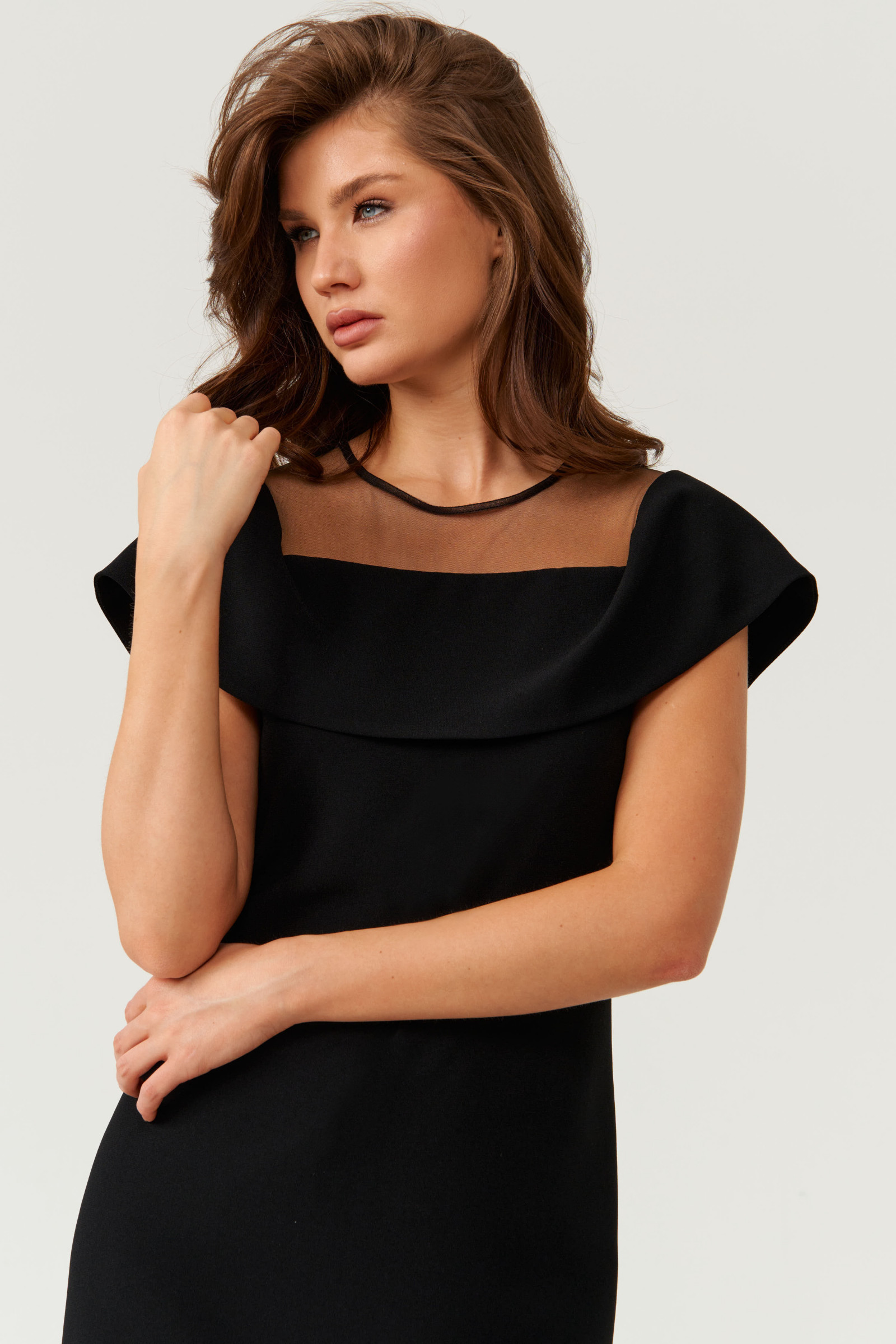 Платье женское из струящейся ткани. Платье прямого силуэта. Перед имеет две нагрудные вытачки. Спинка со средним швом и двумя талиевыми вытачками, в среднем шве располагается потайная застежка-молния и застежка в виде капельки на петлю и пуговицу. В среднем шве имеется шлица к низу изделия. Горловина с воланом создавая имитацию отворота, а также горловина обработана сеткой. Рукава кроткие. Платье на поливискозной подкладке. Платье длиной миди. Стильное платье черного оттенка станет не заменимой вещью в вашем гардеробе, данное платье подойдёт как для повседневной, так и для т торжественной носки. Платье придаст вам изящный и чарующий вид, в нем вы точно вскружите всем голову.