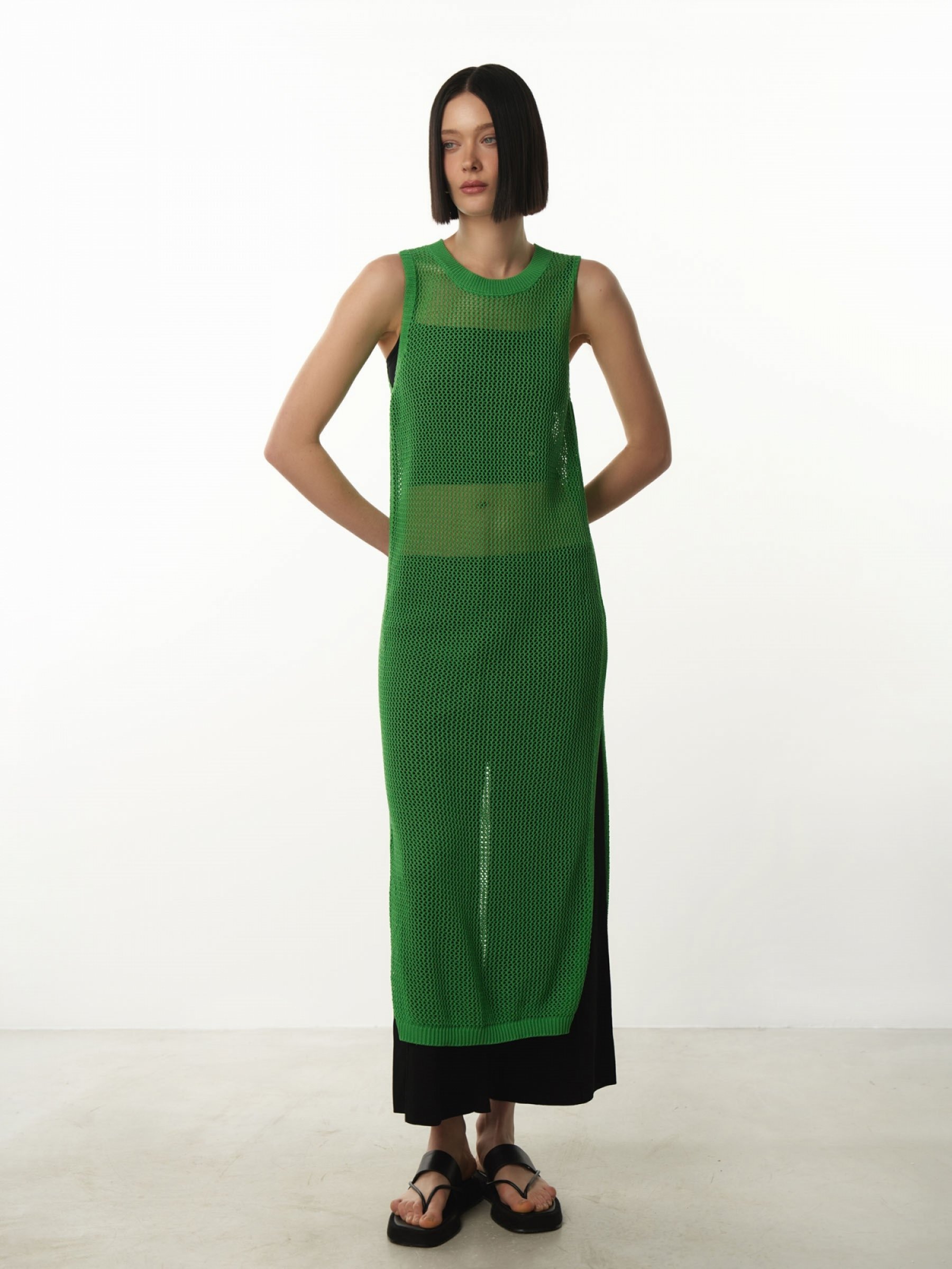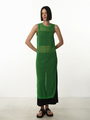 Стильное платье миди без рукавов в футуристическом стиле. Материал – сетчатый трикотаж на основе высококачественной вискозы.Круглая горловина,пройма и низ декорированы фактурной резинкой. Вертикальные полосы гладкой вязки по бокам визуально вытягивают силуэт. Боковые разрезы добавляют луку небрежности и обеспечивают свободу движений. Сочный зеленый цвет травы сделает платье акцентной вещью образа.