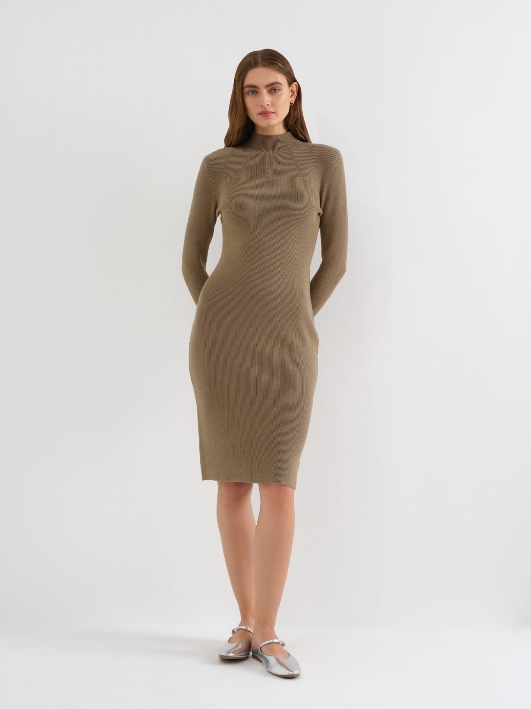 Базовое трикотажное платье миди – чистый лист, на котором вы напишете образ в любой нужной тональности. За счет плотной вязки фактурной резинкой кашкорсе модель работает в унисон с силуэтом, не привлекая внимания к нюансам. Область декольте декорирована вязаными строчками, которые делают легкий акцент на портретной зоне. Для ежедневного комфорта выполнили платье в смесовом трикотаже из вискозы и синтетических волокон.