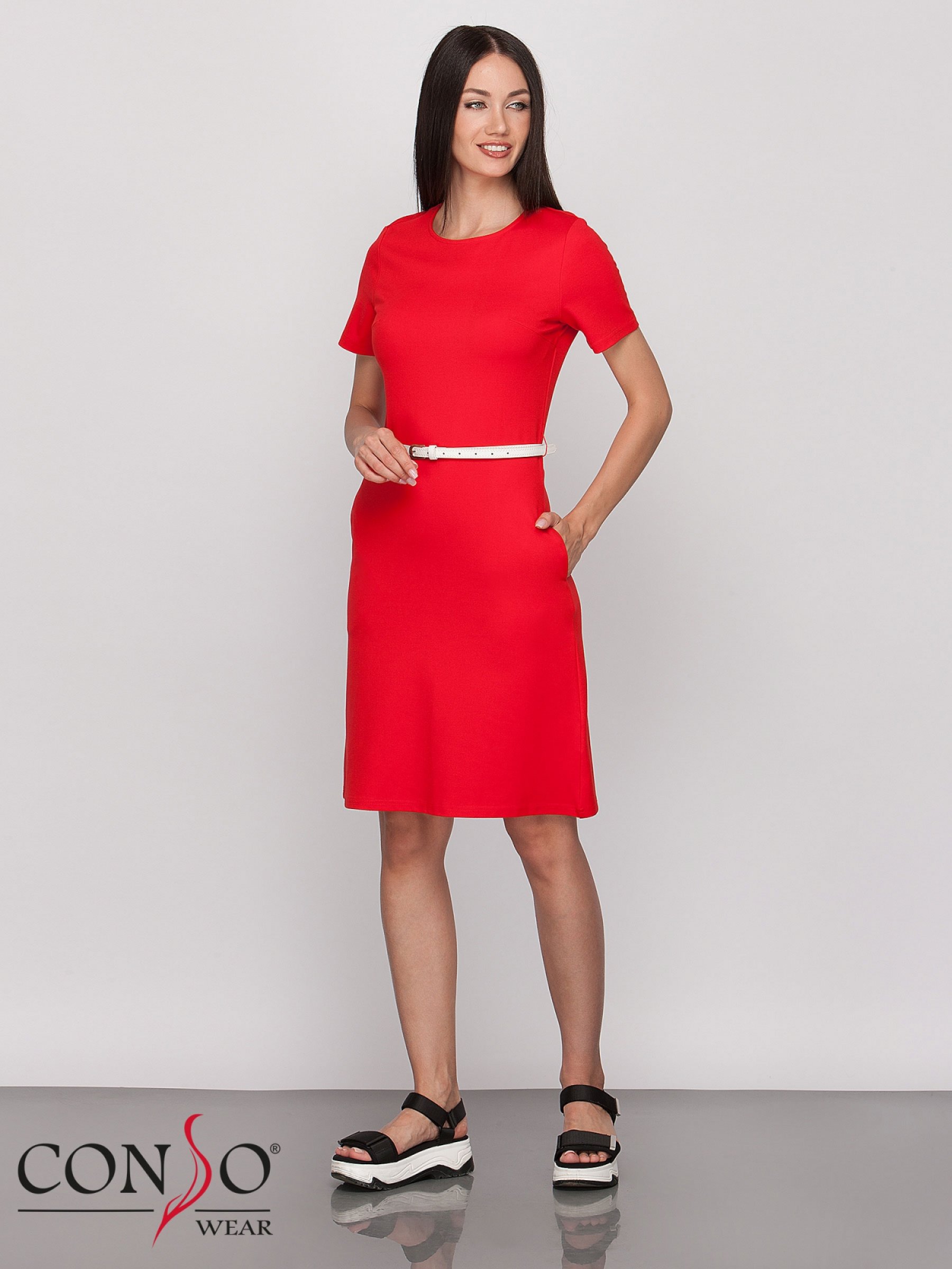 Однотонное платье классического силуэта длиной выше колен. Модель с врезными карманами дополнена контрастным поясом. Платье изготовлено из мягкой эластичной вискозы.