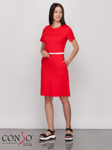 Однотонное платье классического силуэта из мягкой эластичной вискозы. Модель с врезными карманами дополнена контрастным поясом.