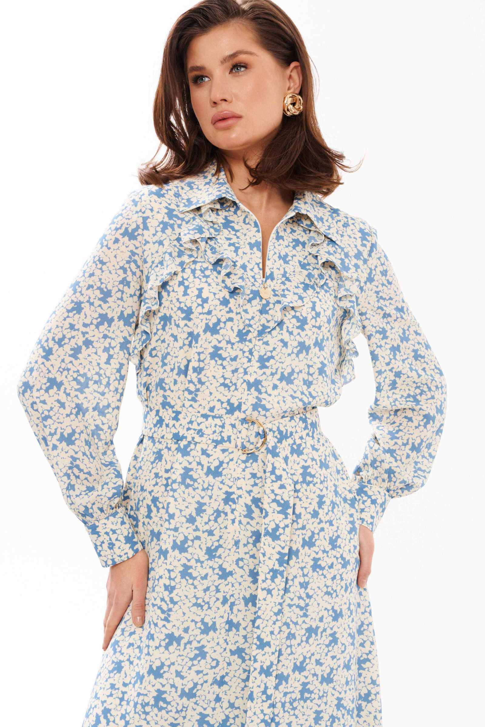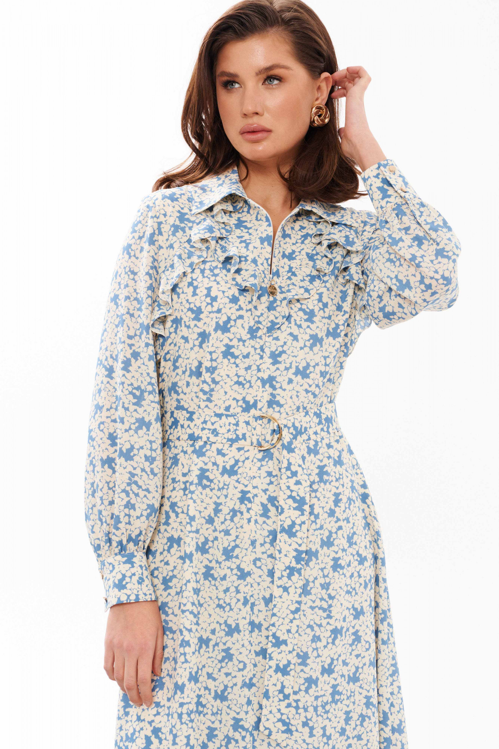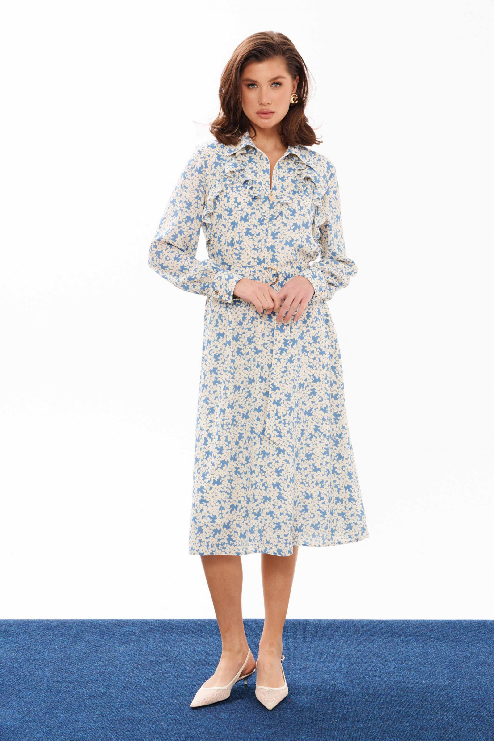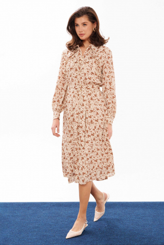 Платье женское из струящейся ткани для повседневной носки. Платье трапециевидного силуэта. Перед со средним швом и потайной застежкой-молнией в шве, также имеются отрезные детали с рюшами от горловины до проймы и до среднего шва. Спинка со средним швом. Горловина обработана рубашечным воротником с отрезной стойкой. Рукава втачные длинные, низ рукава имеет небольшую сборку, обработан притачной манжетой с застёжкой на обметанные петли и пуговицы. Длина платья миди. Платье на натуральной вискозной подкладке. Стильное и модное платье в котором вы обязательно будете красиво смотреться. За счет натуральной подкладки платье будет комфортное к телу, что будет создавать лёгкость и воздушность.
