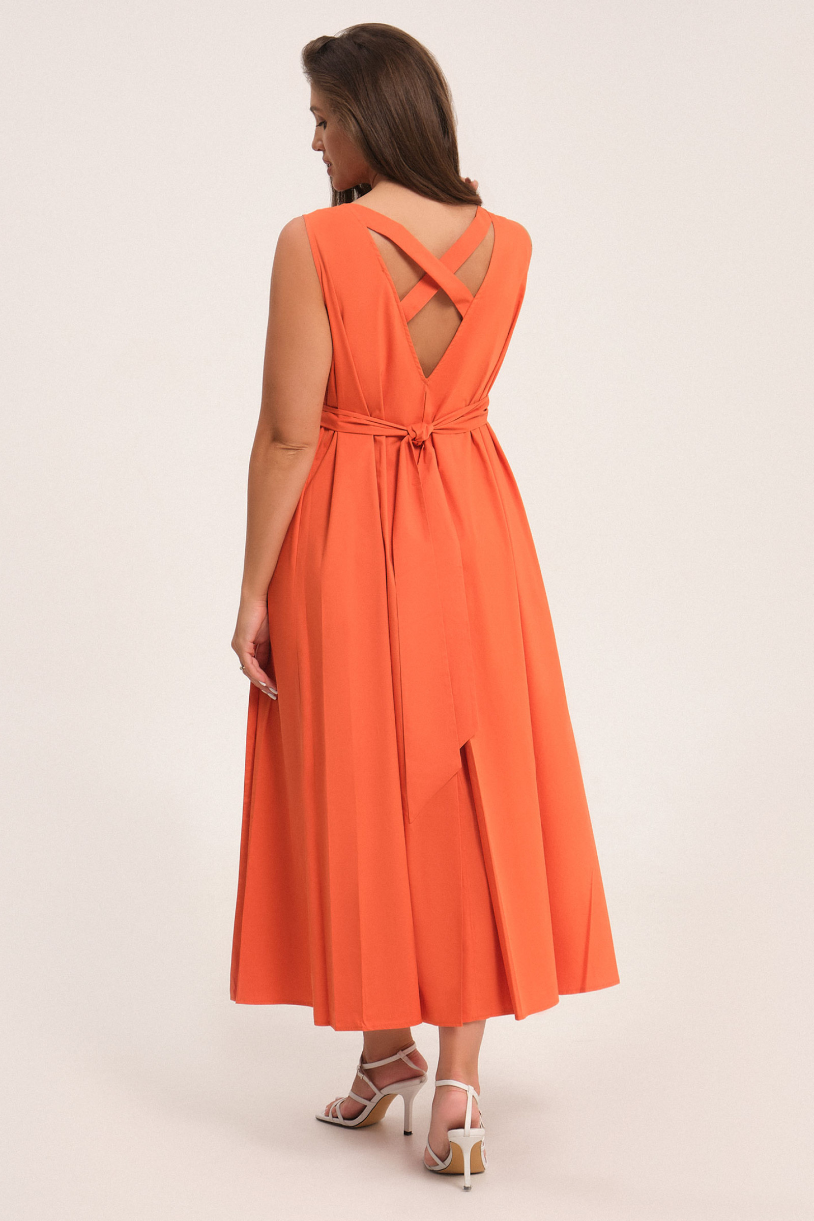 Платье на каждый день – комфортная составляющая гардероба. Именно такими характеристиками отличается эта легкая модель. Ее можно надевать на прогулку, пляж, брать в отпуск. Для создания оригинальных образов добавьте стильные аксессуары, босоножки на плоской подошве, невысоких каблуках, танкетке. Очаровательное длинное платье без рукавов скроено в свободном фасоне. Защипы от боковых швов создают вертикальные плавные волны спереди и спинке. Спина открытая, с глубоким V-вырезом, края которого соединены перекрещивающимися полосами ткани. Горловина тоже V-образная. Материал – хлопковый, нежный, мягкий, струящийся. Вы можете купить платье-сарафан в размерах 42-48 для себя или на подарок близким.