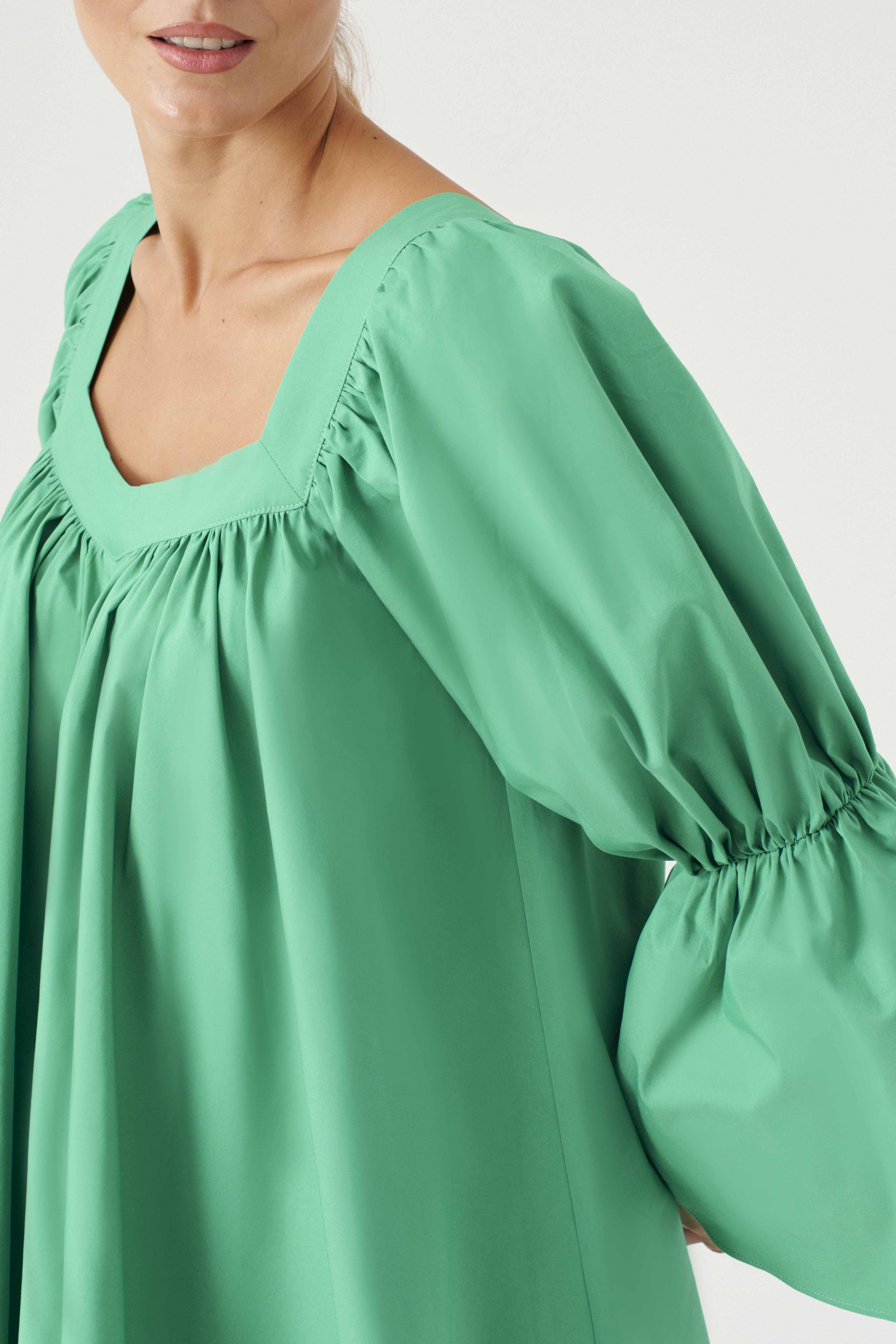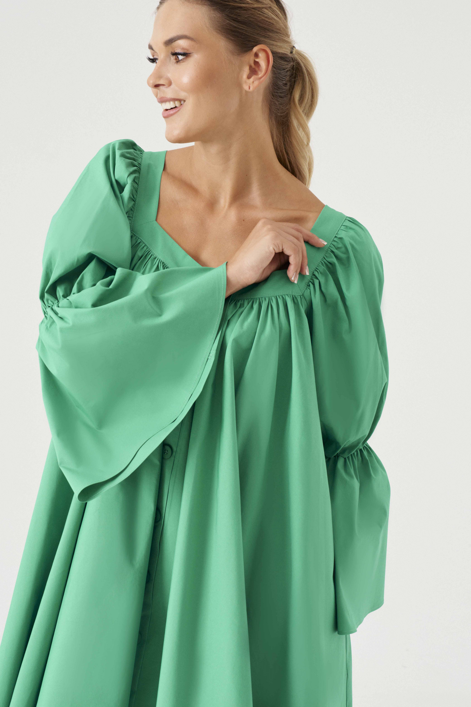 Короткое пышное платье – отличный выбор для стильного вечернего образа. Дополните его аксессуарами и обувью на каблуках, чтобы ваш образ стал элегантным и трогательным. Женское хлопковое платье длиной выше колена скроено в свободном фасоне, полностью скрывает фигуру и подходит для беременных. С первого взгляда внимание притягивает необычный пятиугольный глубокий вырез горловины с акцентом на декольте. От него вниз спускается планка с пуговицами. Оригинальный вид имеет длинный широкий рукав, перехваченный резинкой на локте. Защипы в верхней части лифа создают плавные складки. Если вы хотите купить трикотажное платье для летних вечеров – это именно оно.