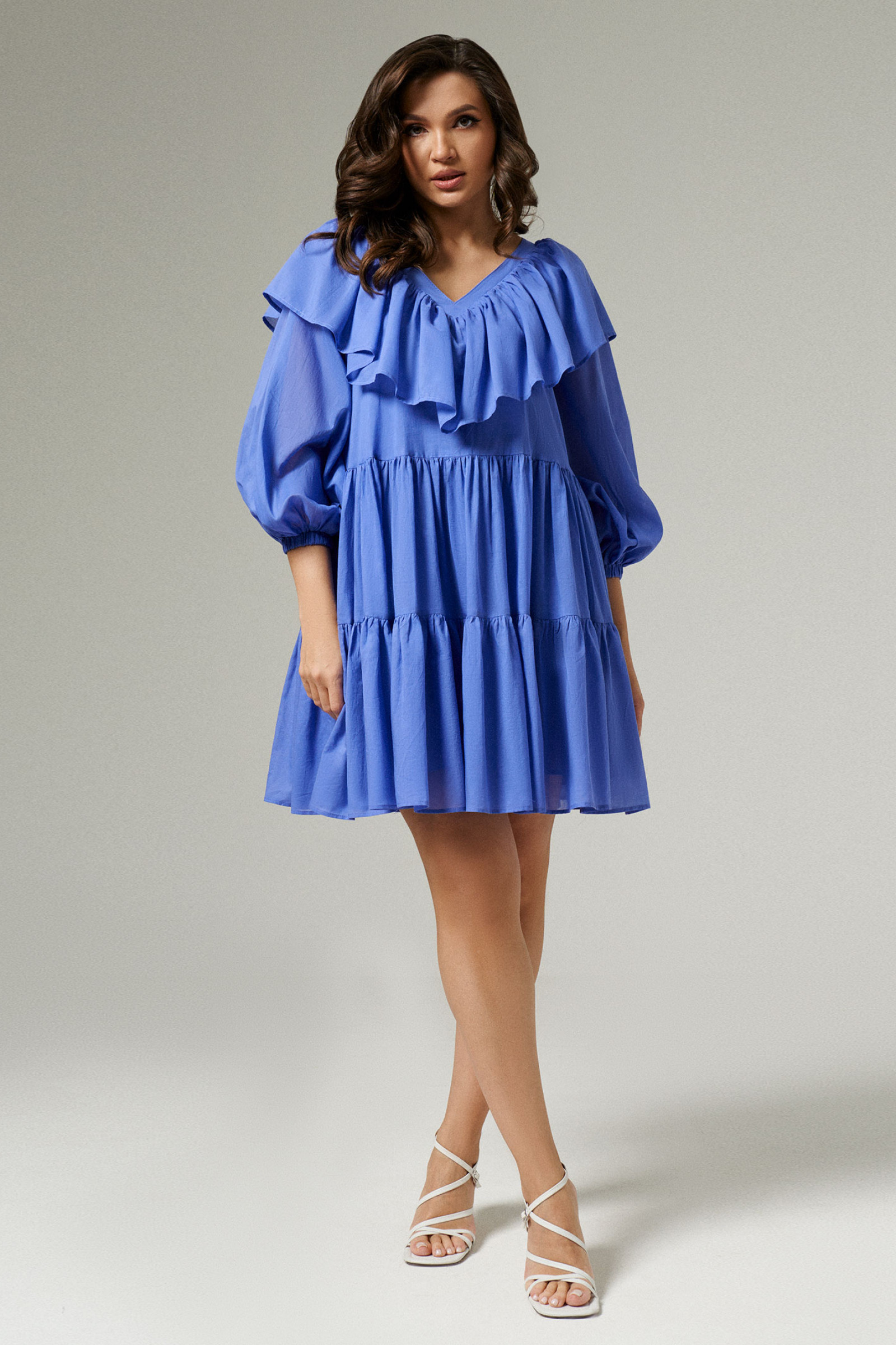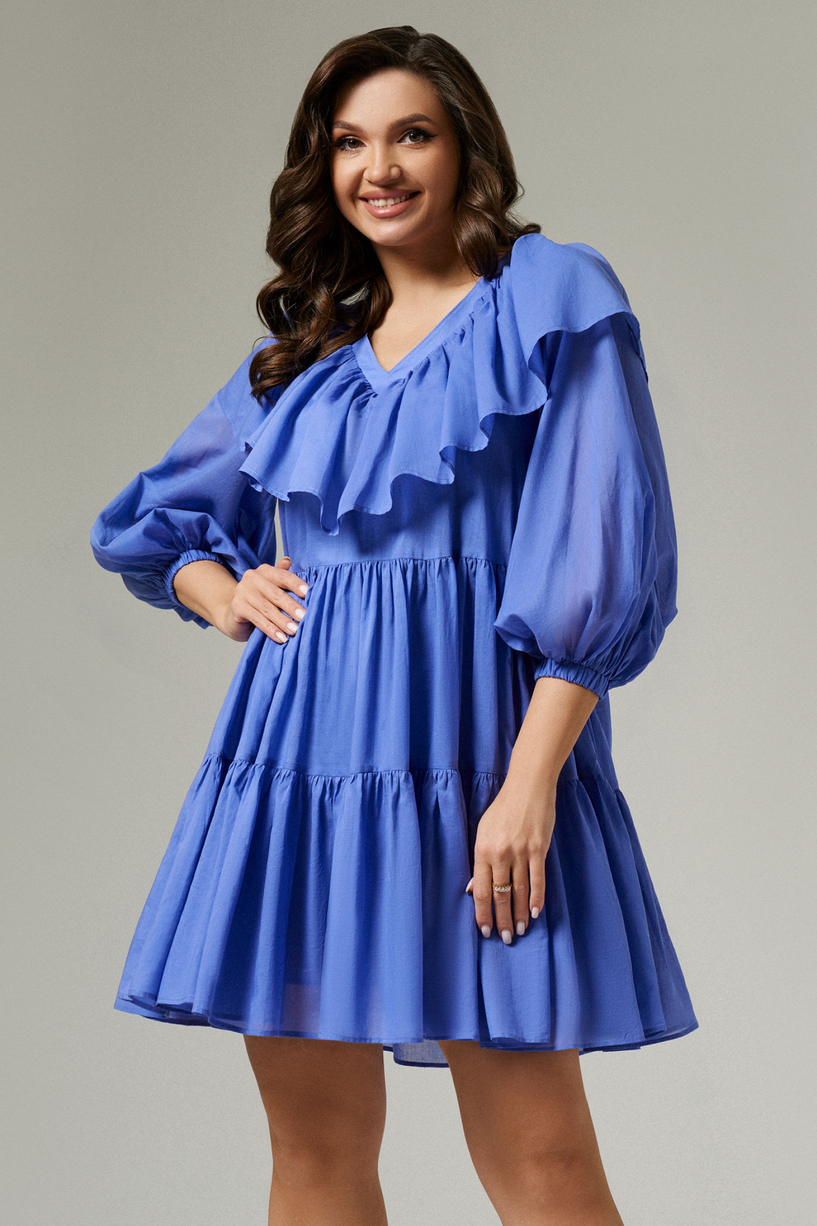 Платье из хлопковой ткани для повседневной носки. Изделие свободного силуэта с V- образной горловиной. Рукав укороченый оформлен притачной манжетой на резинке. Горловина оформлена рюшей. Длина изделия до колена.