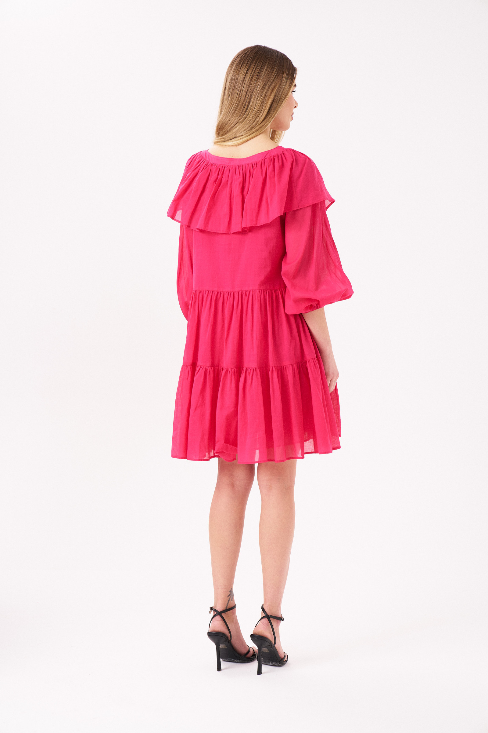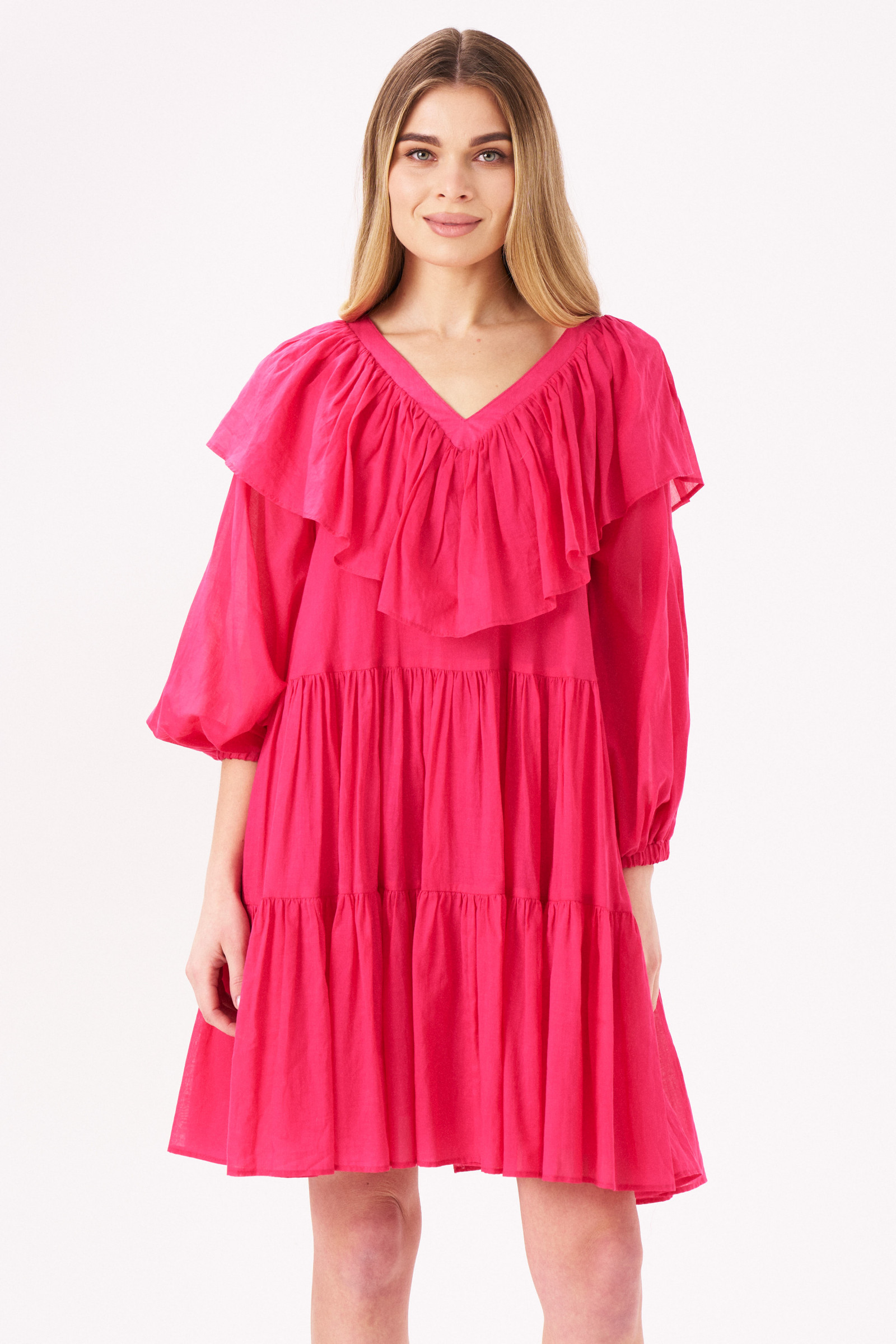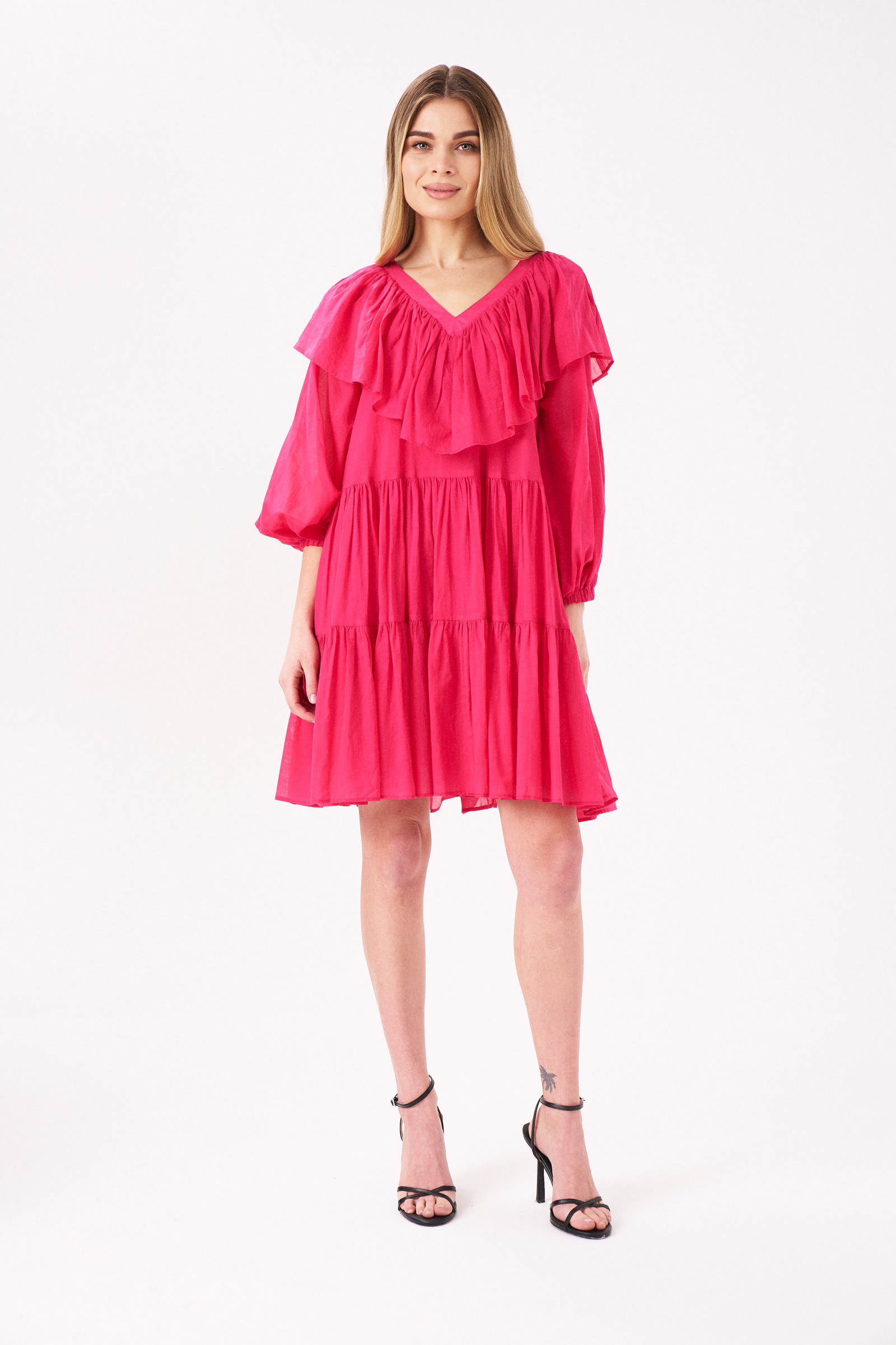 Платье из хлопковой ткани для повседневной носки. Изделие свободного силуэта с V- образной горловиной. Рукав укороченый оформлен притачной манжетой на резинке. Горловина оформлена рюшей. Длина изделия до колена.