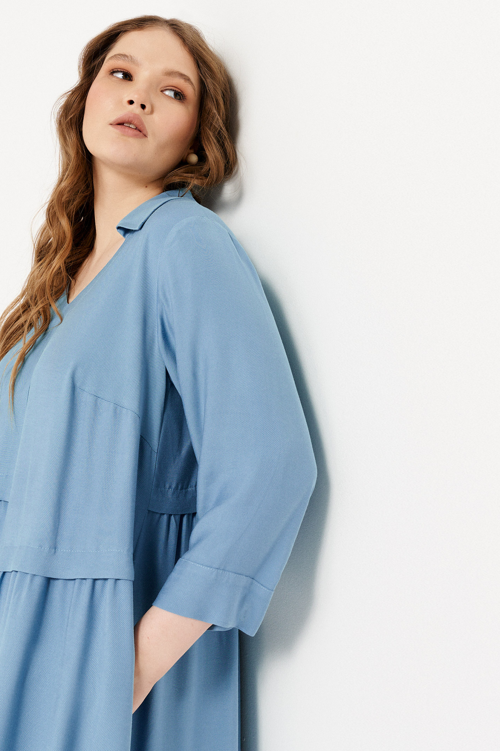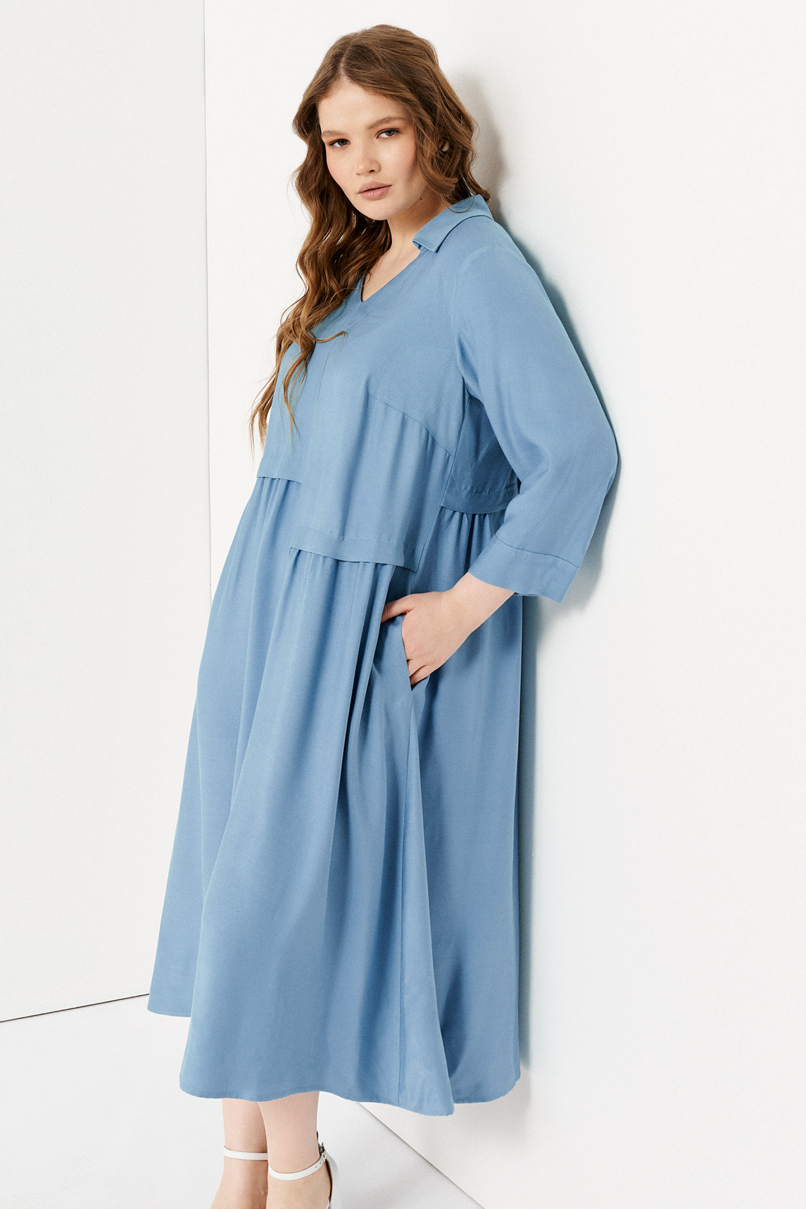 Платье женское повседневное способно подчеркнуть достоинства фигуры, благодаря свободному крою. Эта элегантная модель подойдет для повседневной носки и особых случаев. Платье-оверсайз длиной ниже колена дополнено прямым рукавом длиной ¾ и вырезом горловины в форме буквы V. В качестве дополнения выступает воротник рубашечного вида. Необычно смотрится асимметрия правой и левой полочек переда изделия, а защипы создают эффект волн на юбке. Летнее платье из вискозы также будет удобным для беременных. Воздухопроницаемая ткань создает комфортные ощущения даже в жаркий день. В наличие большие размеры 52-60.