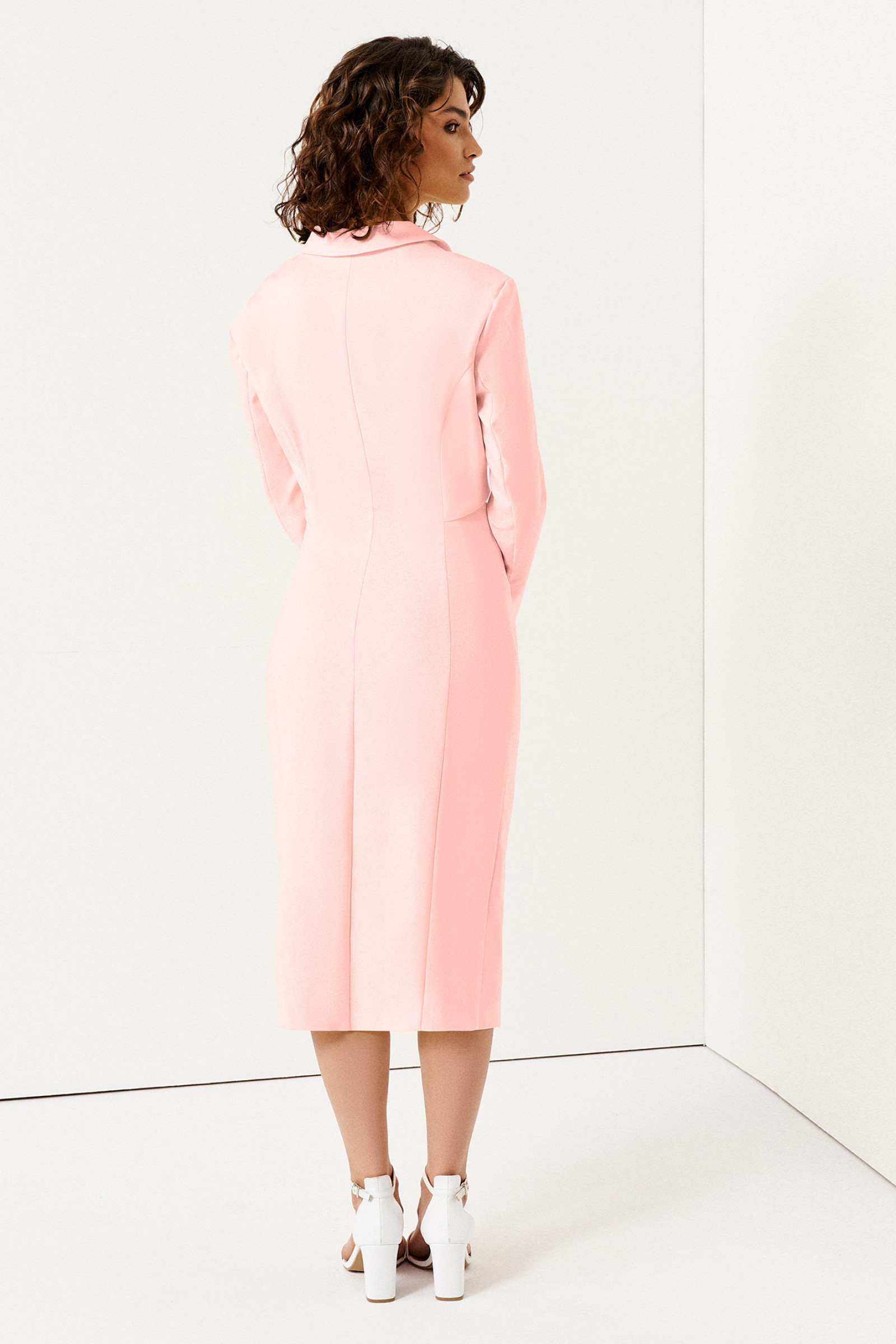 Строгое платье поможет вам стать эталоном делового стиля. Элегантную модель в сочетании со стильными аксессуарами можно надеть также на выход: в ресторан, гости, на праздничное мероприятие. Лучше всего дополнить созданный образ обувью на каблуке или танкетке. Нарядное длинное хлопковое платье с рукавами в деловом стиле имеет полуприлегающий силуэт и оригинальный крой. Верхняя часть имитирует короткий жакет с английским воротником и запахом. Боковые швы на юбке слегка смещены наперед. Один из них заканчивается высоким разрезом на ноге. Изделие доступно в размерах 40-46. Заказывайте летнее хлопковое платье длины миди по самым выгодным ценам.