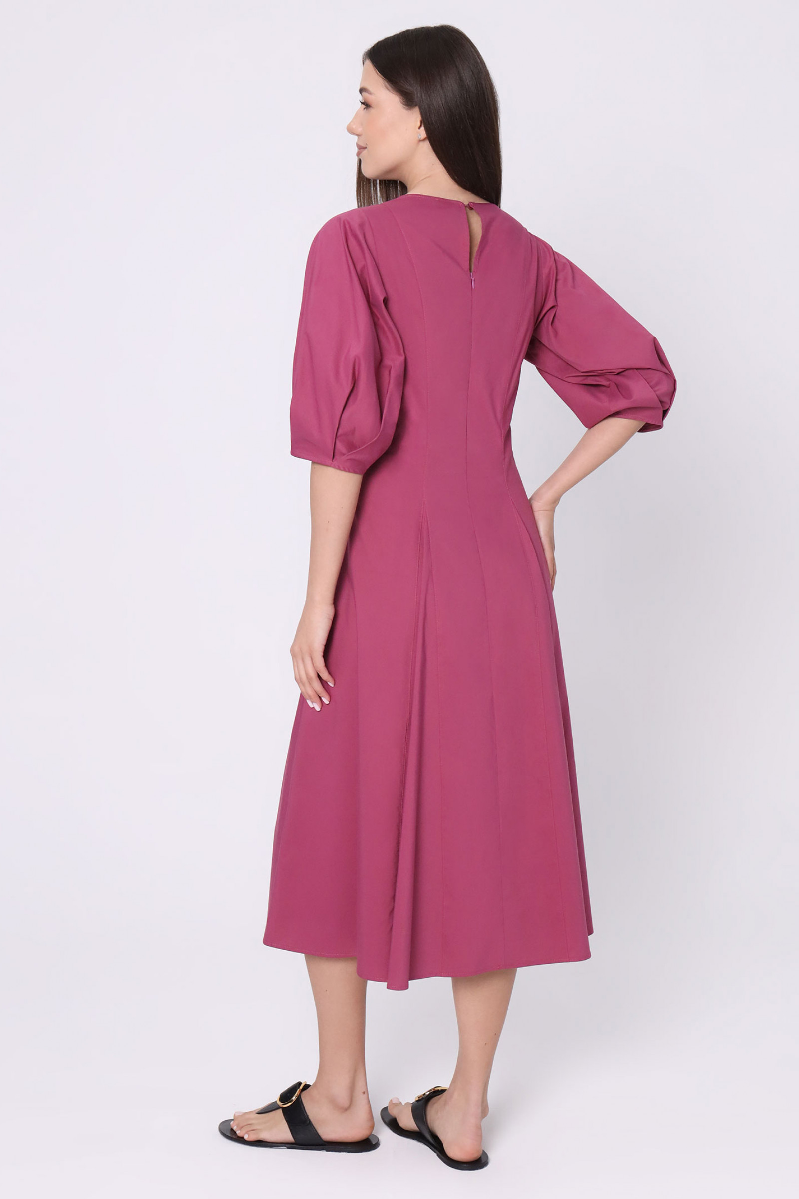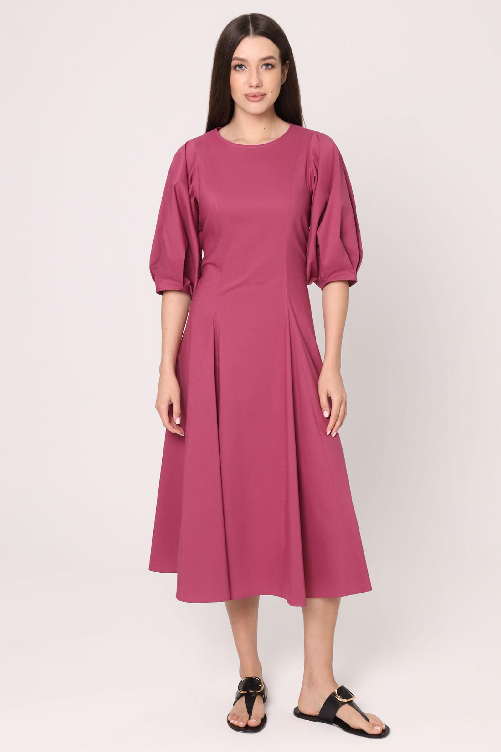 Длинное летнее платье – комфортная одежда для теплого вечера или прохладного дня. В нем вы будете выглядеть элегантно во время прогулки по городу, дружеской или романтической встречи. Подберите соответствующие аксессуары, наденьте обувь на удобной танкетке – наслаждайтесь отдыхом и своим безупречным внешним видом. Стильное хлопковое платье с объемными рукавами ¾ отлично смотрится на фигуре любого типа, благодаря слегка приталенному фасону. Фигурные швы и защипы создают красивые волны на свободной юбке. Длина изделия – ниже колена, вырез горловины – круглый. Вы можете выбрать и заказать модное летнее платье на выгодных условиях.