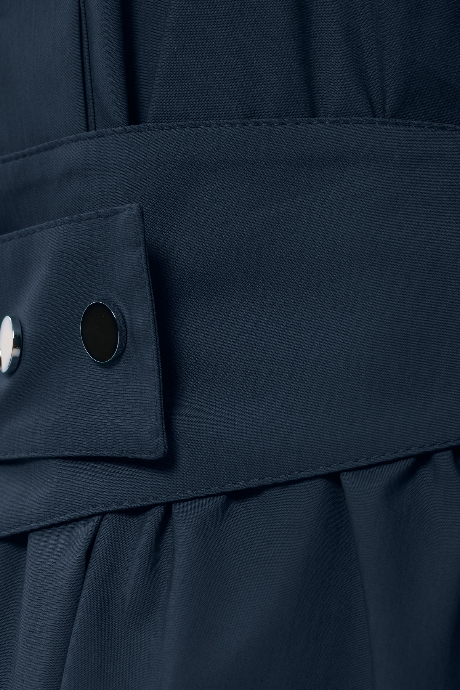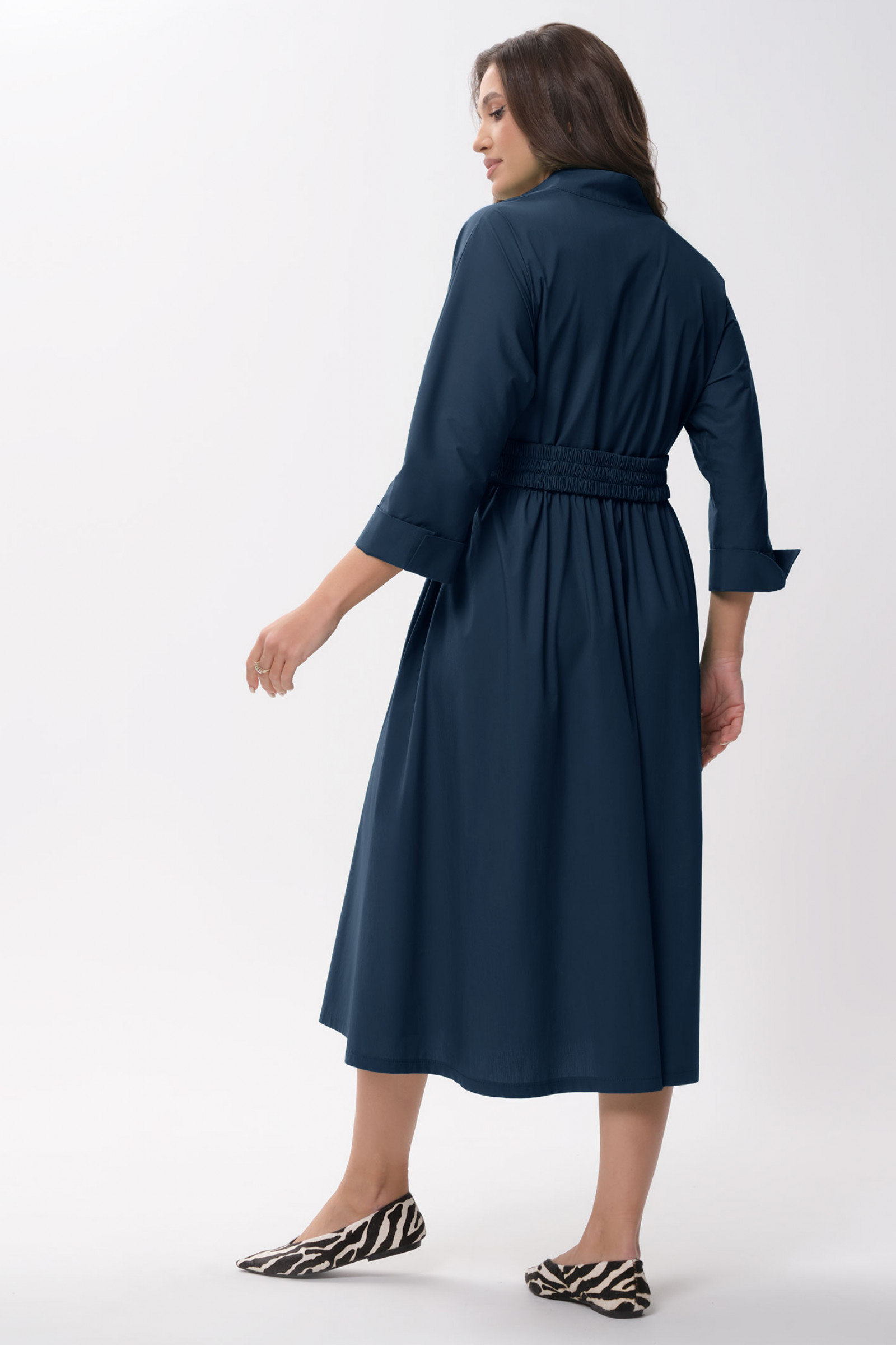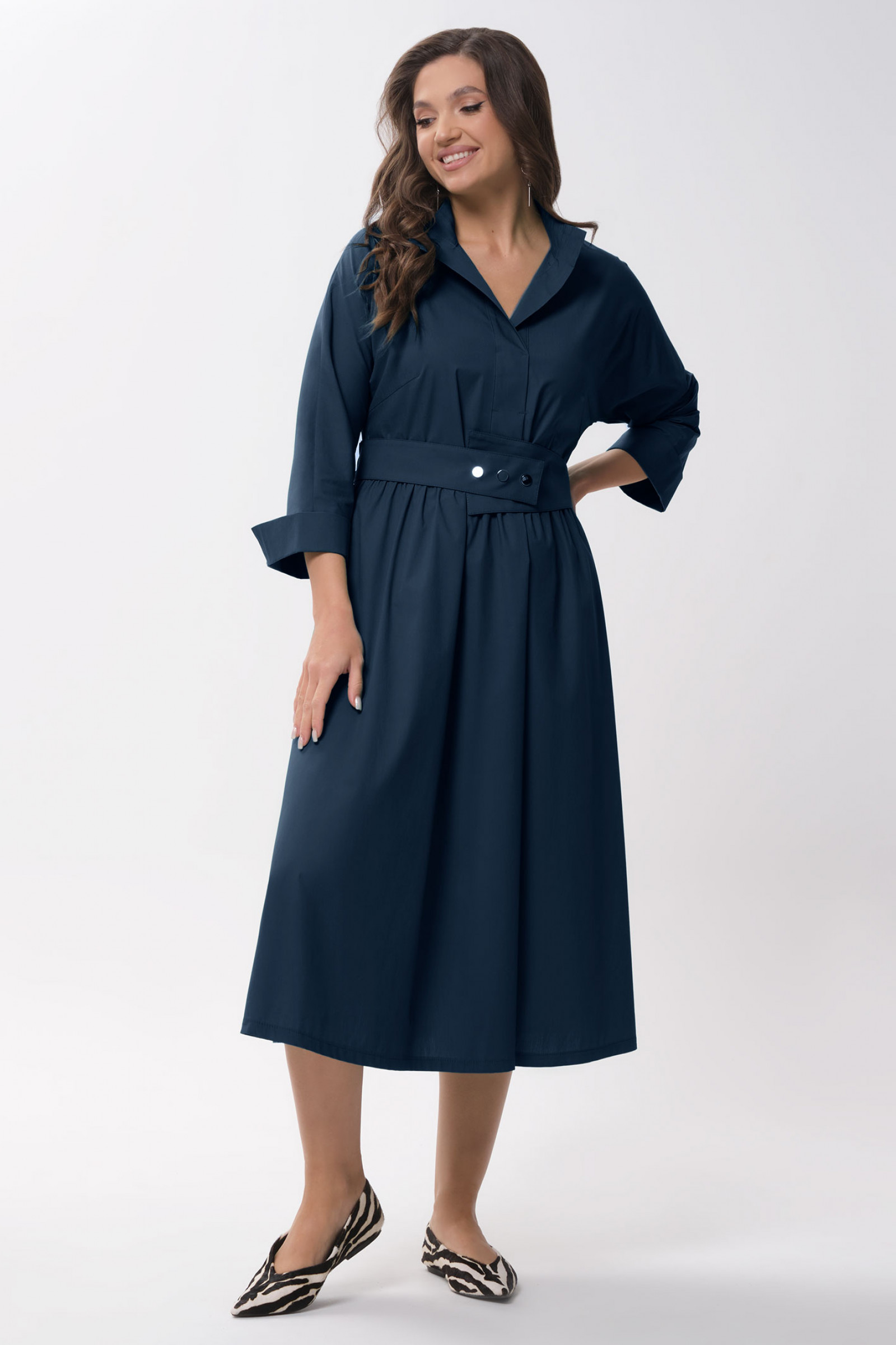 Платье из хлопковой ткани для повседневной носки. Изделие А- сиуэта с укороченым цельнокроеным рукавом оформленым притачной отложной манжетой. Воротник отложной. Изделие укомплектовано поясом из основной ткани изделия. В заднюю часть пояса вставлена резинка. Длина изделия до середины голени.